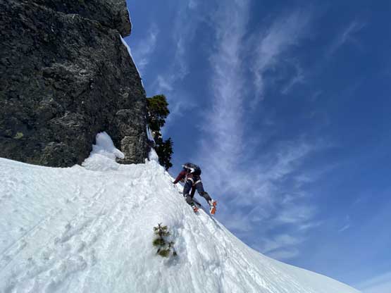 I found a slightly bigger tree just to the left of Winnie and built a bomber belay station for her to lead Pitch 2. We couldn’t see what would be the optimal line but we had to aim for the bottom of an obvious rock buttress on the upper mountain. The line that I saw with the least amount of resistance involved some traversing on down-sloping but low-angled (possibly slabby) terrain out climber’s right but Winnie being a climber, charged straight up the pitch attacking the rock bands head-on. This turned our Pitch 2 into the crux of the trip. I was barely able to follow it up without falling. Upon seeing the upper route I offered to lead Pitch 3 but I forgot to take the rock gears from Winnie’s harness. The rock step turned out harder than appeared and I didn’t feel comfortable stepping onto the down-sloping terrain without protection, so gingerly down-climbed to Winnie and grabbed the nuts and cams. Up I went again I managed to place a nut into a crack and now with protection I soldiered onto a bomber tree and then muscled up the rock step to the bottom of the aforementioned rock buttress. Traversing out climber’s right involved one more bushy step that I had to use all forms of vege-belay techniques to man it through. Then onto an easier snow bench, around the corner of the buttress onto the east side of the summit block I climbed a few more meters of steep and loose snow and belayed Winnie up on a bomber tree station. The passage to the summit from this point was just a simple 45-degree snow climb.