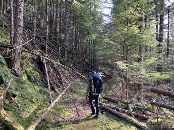 Among the North Shore peaks Mt. Harvey doesn’t stand out by any measurement but it does boast a steep north face with an obvious “ramp” that cuts diagonally across the face making an aesthetic winter route that I had soloed in 2017. Right next to the North Ramp sits an impressive outlier unofficially named “Harvey’s Pup”. Unlike most of the peaklets in North Shore Mountains this one boasts at least 50 m prominence and does not have a “tourist route” to the summit making it very legit to qualify as a separate summit. There are really only two published routes. “Harvey’s Pup” is not a secret in the rock climbers’ circle as the “Pup Buttress” is documented in the Alpine Select and has at least half a dozen well-written trip reports online. However, the grade of 5.10a combined with the added SW BC challenges such as the vagueness of beta means it’s out of the league for someone not veteran in rock climbing (ie. myself). The route that actually intrigued me was a traverse from Mt. Harvey’s hiking trail diagonally down into the climber’s descent gully. This route has only one trip report on the old ClubTread forum but the report was poorly written that it’s nearly useless as beta source. The traverse likely involves “vertical bushwhacking” and the climb on the Pup’s south face out of the gully was reported “maybe stiff class 3” in that report but upon consulting with at least one local climber I’ve determined that rating was likely sandbagged. Those guys were competent climbers and they rappelled the face so that indicated the ascent was definitely more challenging than “class 3”.
