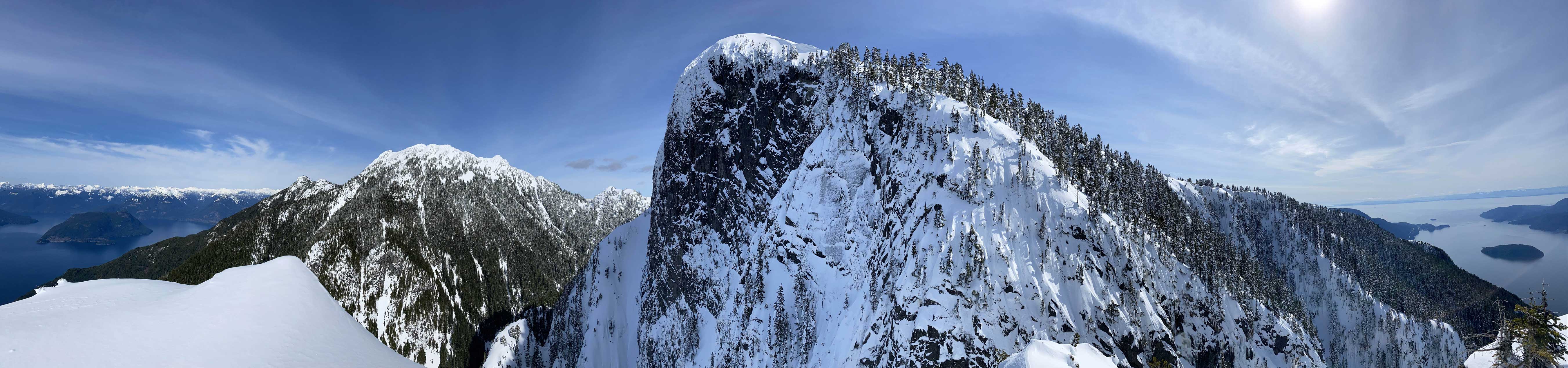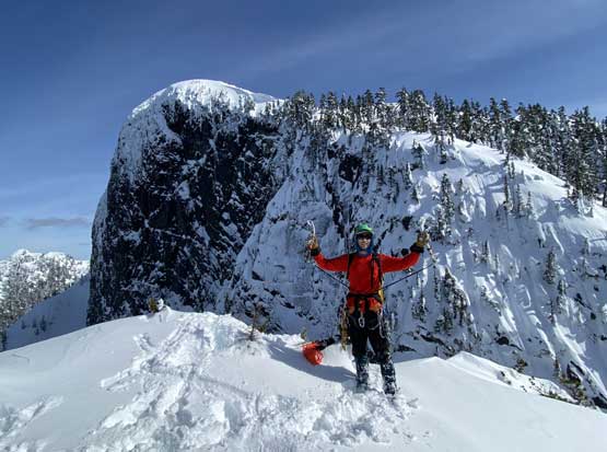 For a few years I thought about to just copy their trip and figure out that ugly traverse and I’ve spent hours analyzing photos taken from various angles, and yet I could not convince myself the feasibility of that traverse, or I should say I didn’t want to embrace the level of vagueness and unknown of that route. Upon further research I came up with a third solution, that was to ascend the climber’s descent gully to near Pup/Harvey col in winter conditions. The descent gully had been reported to involve half a dozen rappels on wet slabs with sketchy anchors in summer conditions, but what about in winter… There was zero information online but the Sentinel Hub satellite images taken in April suggested the gully could very likely be completely filled in with snow that the climb would be no harder than a simple ascent of 45-degree snow. The downside would be the unknown challenges on the south face as winter conditions would make it into the realm of mixed climbing, but the North Shore Mountains usually holds unbelievable amount of good-quality snow that the snowpack might actually ease the difficulty. At least that’s what I was hoping for but I would not count on that. The maximum amount of snow occurs each year around the first half of March in this part of BC so that’s the time I wanted to try this route out. On technical missions like this Winnie M. would be the ideal partner and we pulled the trigger at the last minute upon seeing what seemed like a prime window for the North Shore Mountains. There had been some snow events but numerous gullies had been skied recently with no instability reported whatsoever.