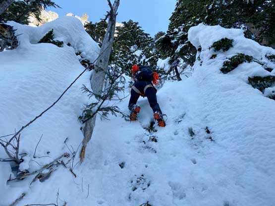 I found a slightly bigger tree just to the left of Winnie and built a bomber belay station for her to lead Pitch 2. We couldn’t see what would be the optimal line but we had to aim for the bottom of an obvious rock buttress on the upper mountain. The line that I saw with the least amount of resistance involved some traversing on down-sloping but low-angled (possibly slabby) terrain out climber’s right but Winnie being a climber, charged straight up the pitch attacking the rock bands head-on. This turned our Pitch 2 into the crux of the trip. I was barely able to follow it up without falling. Upon seeing the upper route I offered to lead Pitch 3 but I forgot to take the rock gears from Winnie’s harness. The rock step turned out harder than appeared and I didn’t feel comfortable stepping onto the down-sloping terrain without protection, so gingerly down-climbed to Winnie and grabbed the nuts and cams. Up I went again I managed to place a nut into a crack and now with protection I soldiered onto a bomber tree and then muscled up the rock step to the bottom of the aforementioned rock buttress. Traversing out climber’s right involved one more bushy step that I had to use all forms of vege-belay techniques to man it through. Then onto an easier snow bench, around the corner of the buttress onto the east side of the summit block I climbed a few more meters of steep and loose snow and belayed Winnie up on a bomber tree station. The passage to the summit from this point was just a simple 45-degree snow climb.
