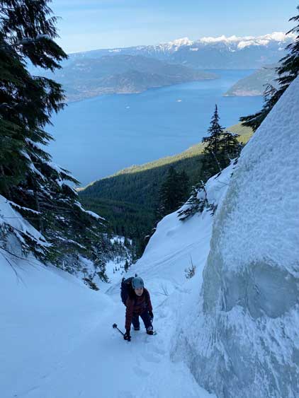 Just about when the couloir started to narrow down into the first constraint we found a flat spot under climber’s right side of the wall to ditch snowshoes and strap crampons on. This first constraint was about 40-45 degrees only but narrowed down to under 3 meters wide. We were both attracted by the ice wall and we promised each other that if we finished the climb with spare time we’d do some laps on the ice. Above the first constraint we had a while of mellower terrain leading into a major fork in the couloir. We would pick the left (narrower) branch shooting straight up towards Pup/Harvey col. The terrain would soon steepen to 45 degrees and we both ditched the pole and took out the second ice tool. The snow climbing was fairly mellow thank to the superb conditions. We did encounter a few stretches of front-pointing but for the most parts we were able to kick bucket steps into the slope. Near the top of the gully I led us trending climber’s left into a zone of 50-degree forest and we kept soloing until what seemed like a 60-degree icy pitch stopped the further progress. I gave the rope to Winnie and she soloed it with no problem. I soloed it halfway up but didn’t quite trust the ice tool placements so asked her to drop the rope down for a belay. Awkward… After about 10 minutes of heavy spindrifts the rope finally reached me and now with safety on my side the steep snice climbing felt actually quite fun.