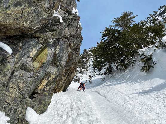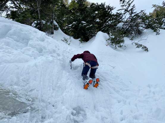 The summit was surprisingly spacious so we lingered a long while soaking in the views. We were not in a hurry to descend as we were doing great on time. For the descent we decided to gingerly down-climb the upper route around the rock buttress to save some hassle. Then I led three rappels down roughly our ascent line from one tree station to another. The last rappel was optional but the trees were too good to not use. By this point the gully/couloir was baked under the sun for a few hours so the down-climbing no longer involved front-pointing. Fresh snow balling under the crampons were pretty annoying though, but nonetheless we made some fast progress down the gully. Lower down the sun’s out again and we each did two laps on that short ice wall. This was my first ever time climbing on waterfall ice and I had to say it’s very fun. Descending the lower gully on those hard avi debris was not as fun but not difficult.