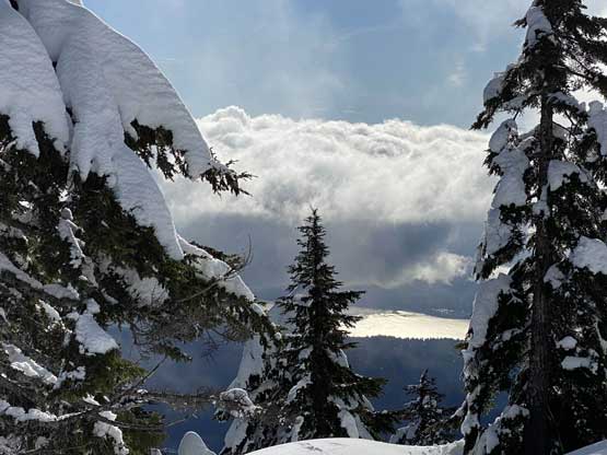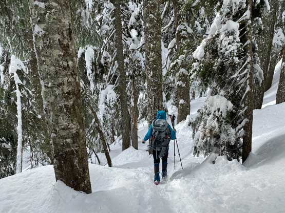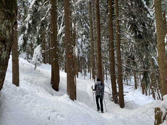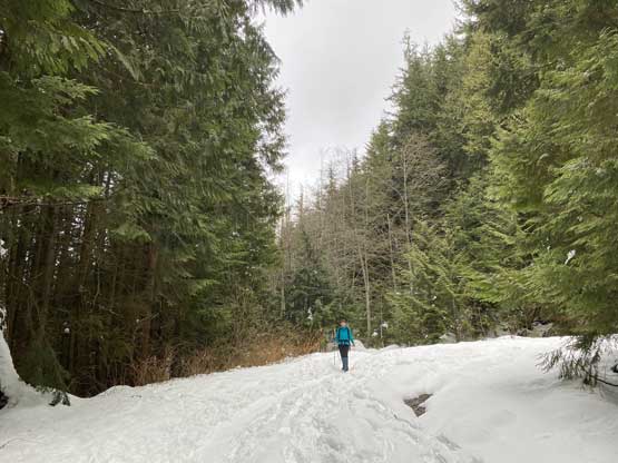 The lower portions of this trail was literally a maze. I’m sure any trail would go but having the Gaia GPS map surely made things easy. I might not have picked the widest trail at the start but definitely picked the most direct path. After a few hundred meters of elevation we joined what seemed like a popular mountain bike trail. We took a ton of short-cut on this portion as the biking trail was clearly too “flat” for hikers. At about 700 m we came across the first logging road and its here that the snow finally became continuous. At 820 m elevation we came across the second stretch of logging road. The footpath had become very well-trodden as the lower trails had converged to a single path at this point.