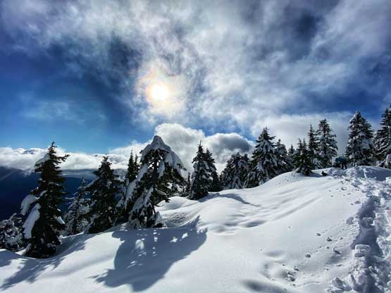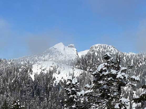 The grade of the terrain was actually mellower than the start of this hike, until the last 200 m rise to the summit. The steepest portion of this trail was definitely the last part. I was impressed by the popularity of this hike as well as the depth of the trench packed down by hikers. We had come with two pairs of snowshoes but we certainly had taken them for a walk. The weather had been cloudier than forecasted but we did manage to get some views from the summit with The Needles and Cathedral Mountain stealing the show.