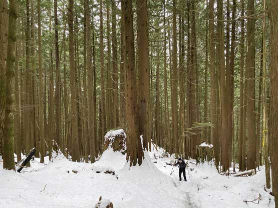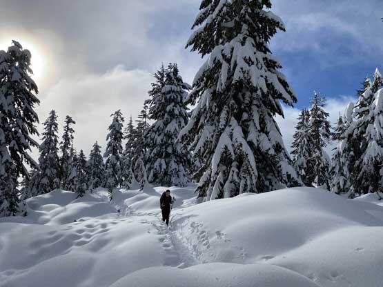 The lower portions of this trail was literally a maze. I’m sure any trail would go but having the Gaia GPS map surely made things easy. I might not have picked the widest trail at the start but definitely picked the most direct path. After a few hundred meters of elevation we joined what seemed like a popular mountain bike trail. We took a ton of short-cut on this portion as the biking trail was clearly too “flat” for hikers. At about 700 m we came across the first logging road and its here that the snow finally became continuous. At 820 m elevation we came across the second stretch of logging road. The footpath had become very well-trodden as the lower trails had converged to a single path at this point.
