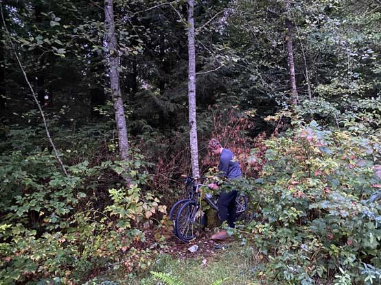 We turned onto Rice Lake Road and crossed Lynn Creek on a concrete bridge. Immediately after the bridge we had a short stretch of steep uphill bike on gravel road and after that we got very confused. I had done zero research about the approach and my reference GPS track only covered the hiking portion. I thought the Seymour Mainline on my Gaia map was the correct road to take but it was gated with very aggressive “no trespassing” signs. I thought we had to ignore the signs just like every other trip with private property issues but before committing to that we realized there’s actually a gate keeper even this early in the day. That guy saw our confusion and gave us the proper direction. After following his instruction for a while I realized the proper road was actually labelled as “Seymour Valley Trail” on my map. I always thought a “trail” is a dirt path for foot travel but maybe that’s not the case here… Francis also had to give me a short instruction on how to do gear switch. The paved road had lots of up-and-downs so being able to switch gears was crucial.. To my surprise I did not find the uphills to be overly exhausting nor the downhills to be overly scary. In under an hour we arrived at Stoney Creek Picnic Area covering over 10 km distance. We turned left onto an old logging road, paddled a short ways but pushed/walked to the proper trail-head once the grade became too steep.