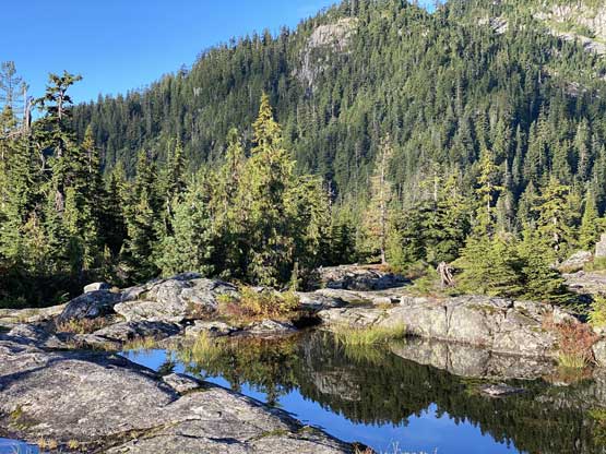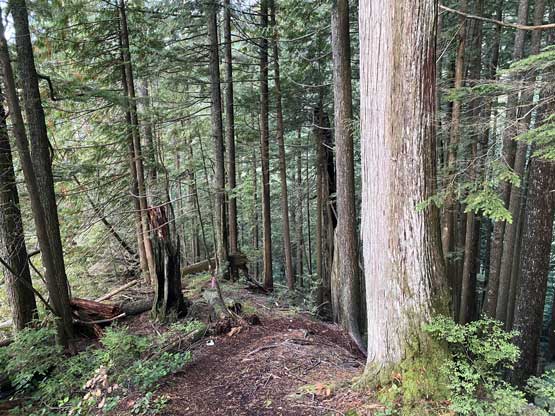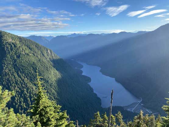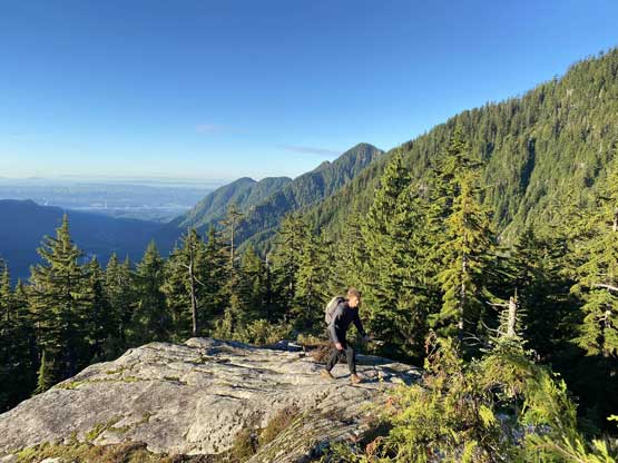 By the time we finished stashing the bikes we also no longer needed head-lamps. The trail was easy to locate and also very easy to follow, but just like most trails in the North Shore Mountains it’s very steep, slippery, rooty and sometimes rocky. As someone coming from the Rockies I thought the immediate coastal areas had the hardest trail quality. There were even 3 or 4 batman ropes installed on some steepest stretches to facilitate the hike and at times I thought we were doing short sections of 3rd class scrambling.