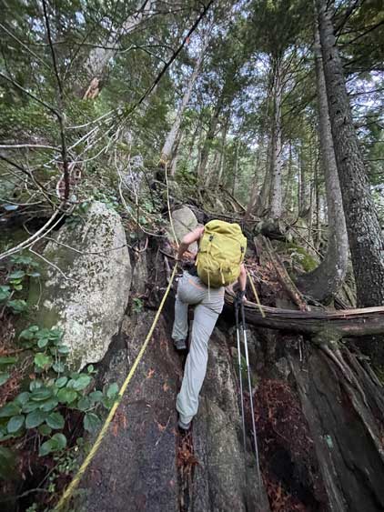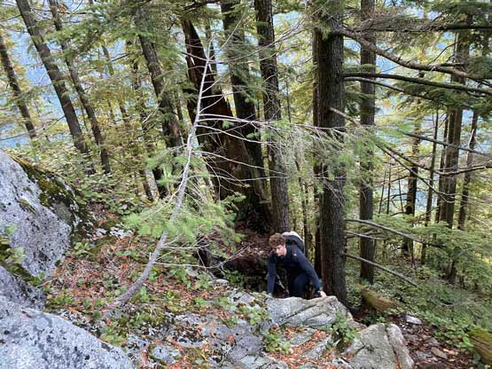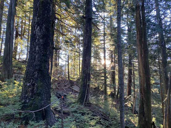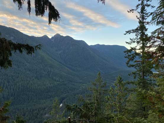 By the time we finished stashing the bikes we also no longer needed head-lamps. The trail was easy to locate and also very easy to follow, but just like most trails in the North Shore Mountains it’s very steep, slippery, rooty and sometimes rocky. As someone coming from the Rockies I thought the immediate coastal areas had the hardest trail quality. There were even 3 or 4 batman ropes installed on some steepest stretches to facilitate the hike and at times I thought we were doing short sections of 3rd class scrambling.