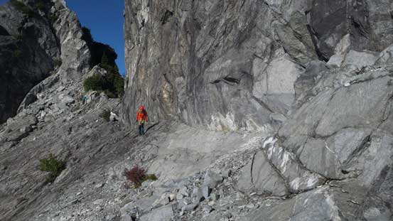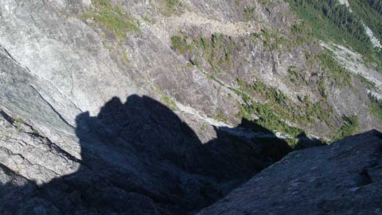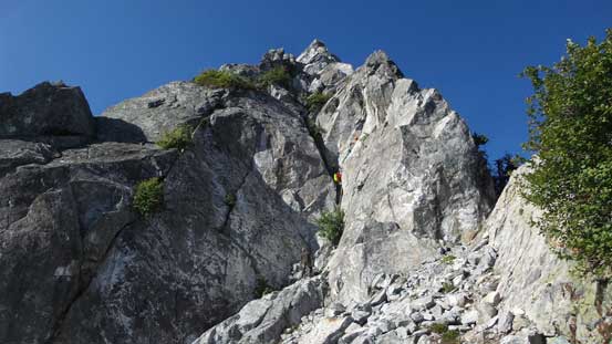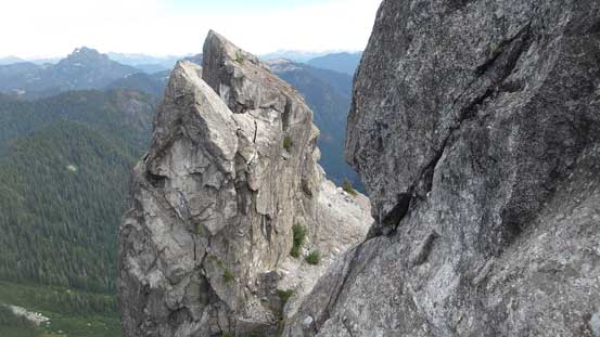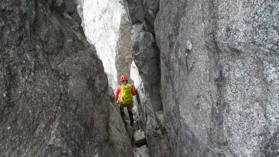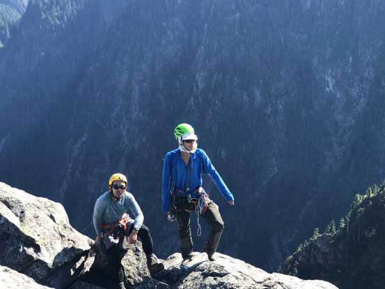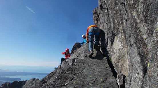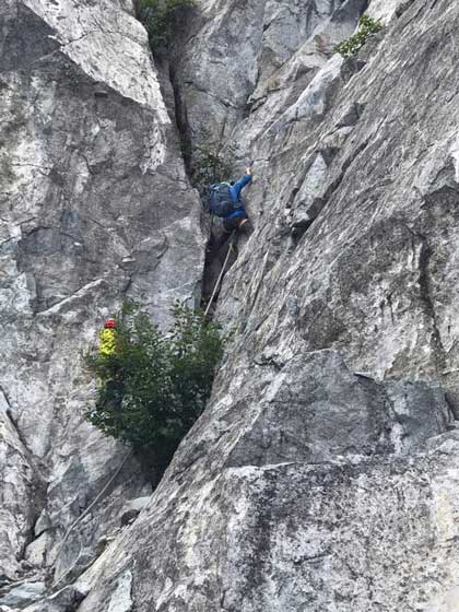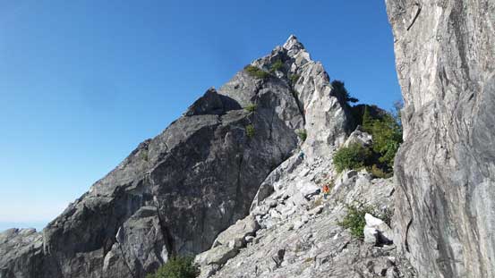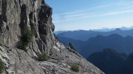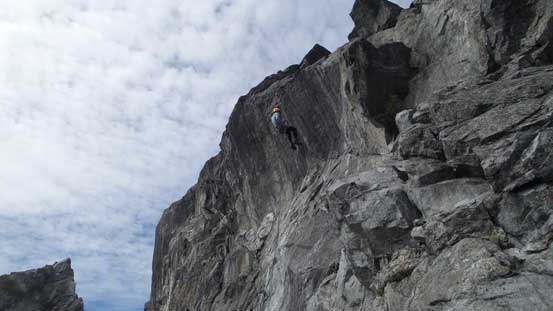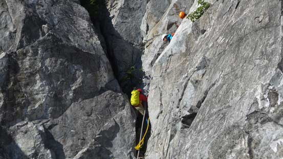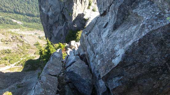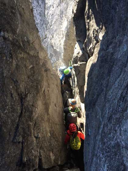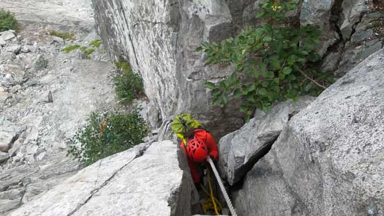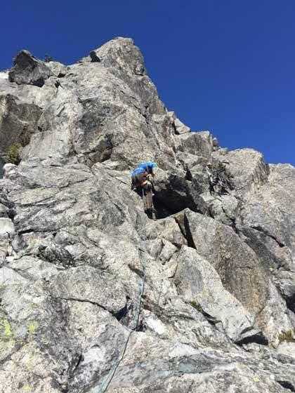 There are two ways to get down into a col. Somewhere on the east side of Crown Mountain’s summit we found a two-bolt anchor such that with a 60-meter rope one can rappel directly down to the col. The second option is by traversing a narrow ledge around the north side of Crown’s summit block and then down-climb a 4th class chimney into the col. This chimney is assisted with two fat batman ropes. It’s tempting to just rap off the anchor but we knew we had to climb back up the chimney anyway so might as well do it both ways. Traversing the narrow ledge into the chimney was easy but the down-climb was a solid “BC 4th class” even when grabbing the ropes. There’s one or two very awkward and strenuous moves although nothing’s super exposed.