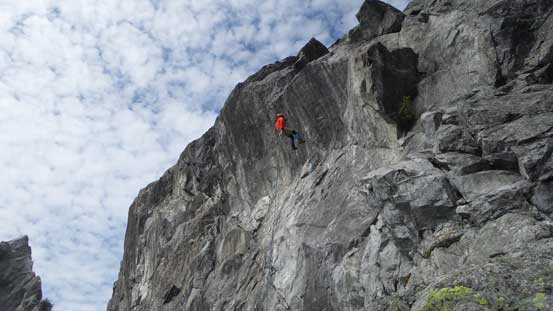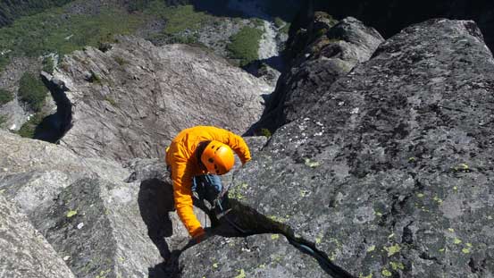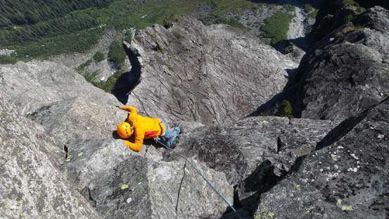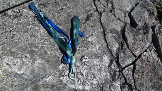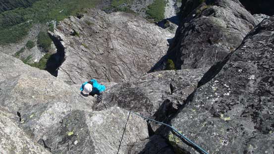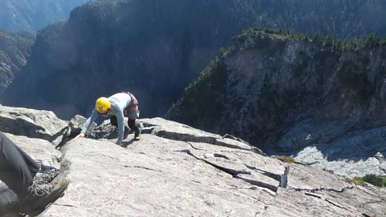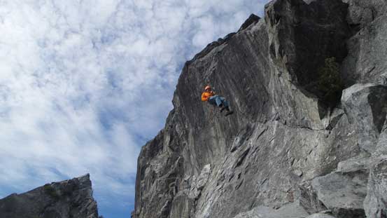 While Jeff was assisting laowei and Kitty on the down-climb, Lily and I traversed over to the base of Camel’s SE Corner to set up a belay station. There’s one tree at a convenient spot offering an easy “sling-around”. The corner doesn’t look hard at all but since we brought a full rack of gears it made sense to pitch out properly. I even donned rock shoes for simple reason of why-not.. The pitch turned out to be a little bit harder than appeared but there’s really just one 5th class (friction) move about 3/4 of the way up, with some pretty good exposure. Below the crux I managed to put 3 pieces of cams in, although the rope drag from my zig-zagging path was pretty severe. The top anchor was an old sling around a boulder that I backed it up with a new quadruple-length sling.