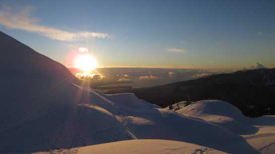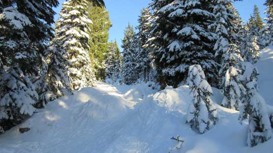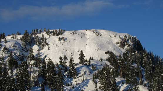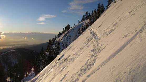 After the parking lot gong show I joined the hordes marching up the packed Seymour main trail. The snowshoes stayed strapped on my backpack as they were absolutely not required on this day.. By the time I reached Brockton Point I didn’t feel like having done enough warm-up yet. The south face of Pump Peak was heavily tracked out by skiers with a fat boot-packing trail in the middle. I had never done this “winter direct” variation and I have to say this line looked uber sexy comparing to the boring trail option so why not. The hike to the base of Pump Peak’s south slopes required a bit of post-holing on undulating terrain but still, the snowshoes weren’t required.