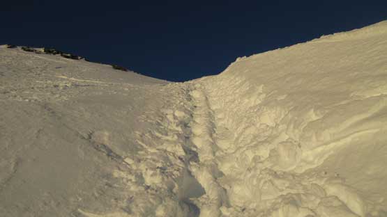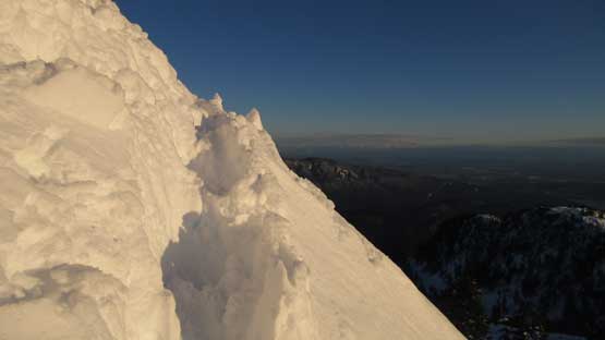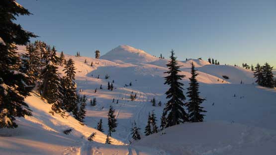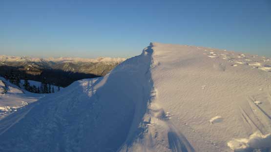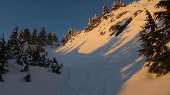 Once starting up the face the grade was actually not as steep as appeared from afar. It’s mostly a 35-40 degree ish staircase walk following the heavy boot steps. The snowpack stability wasn’t a concern on this particular aspect and in no time I topped out. The hike to the actual summit of Pump Peak required a bit of extra work (unexpected) and post-holing but the views were really good now under the evening lighting.
