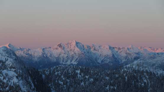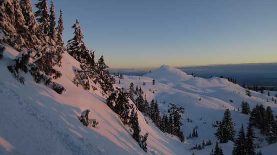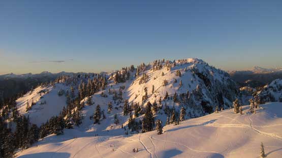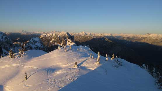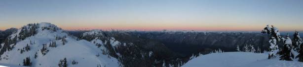 Not doing much lingering I soon turned my attention to the next peak aka. Tim Jones Peak, but first of all I had to lose about 50 meters of elevation down to the saddle. The snowshoes were still not required. The heavy foot traffic continued on upwards towards Tim Jones Peak and my job was as simple as following the beaten peak to the summit. I got there about a couple minutes after sunset with the evening horizons towards all directions.