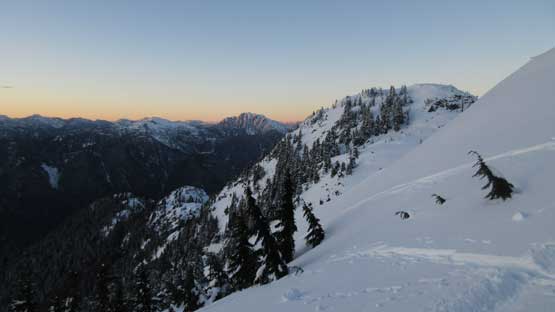 Not doing much lingering I soon turned my attention to the next peak aka. Tim Jones Peak, but first of all I had to lose about 50 meters of elevation down to the saddle. The snowshoes were still not required. The heavy foot traffic continued on upwards towards Tim Jones Peak and my job was as simple as following the beaten peak to the summit. I got there about a couple minutes after sunset with the evening horizons towards all directions.