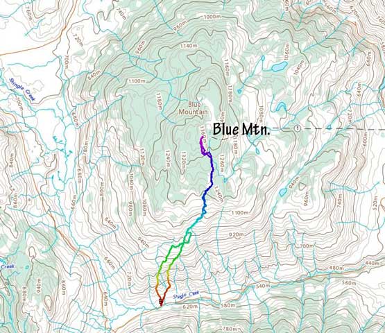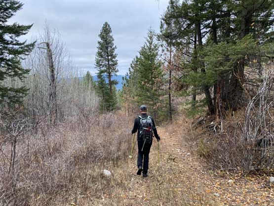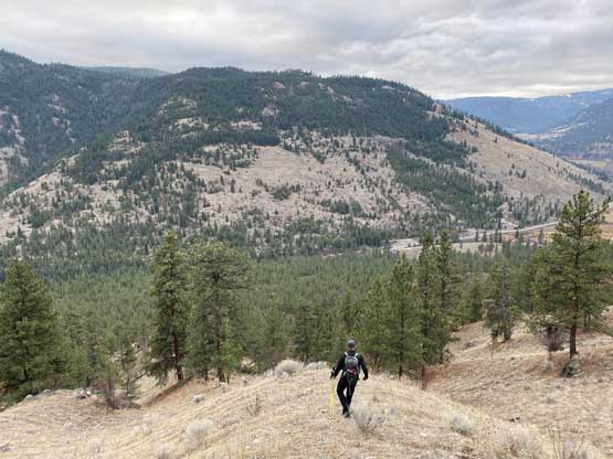 The rough idea of this route was based off Matt’s study but the navigation was mostly confirmed by my “Backroad Mapbook” layer on the premium version of Gaia. This map layer had most, if not all the spur and unnamed roads labelled and they were impressively accurate. The summit was chilly and the weather was 100% overcast so we didn’t linger any longer than necessary. On the descent we mostly followed our own track but did some variations here and there. For the lower 400 m elevation we ignored our route and explored more of the grasslands. The ground was nice and soft and the hiking was fun. We finished the trip in 2.5 hours and just when we were about to leave for “Peak 1431” a guy in an unlicensed vehicle came down the adjacent private road and yelled at us. We thought we were in trouble. This guy was the manager and guard of these Native areas but he wasn’t here to kick us out but he did say that we were in their private properties. We actually told him that we just hiked Blue Mountain and we were going to hike the next peak on the south side of the highway and he seemed cool with it, so we carried on.