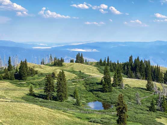 Cornwall Hills is a rather tall summit and the highest point of a broad section of Clear Range immediately to the SW of Cache Creek and to the SE of Marble Canyon. There’s a service road that goes all the way to the very top where a fire lookout is located, but to drive this one a high clearance, 4×4 vehicle is an absolute must. The upper hills offer cool alpine meadows scenery and a (hopeful) escape from the heat as it rises more than one vertical mile above the semi-arid Thompson River valley.
