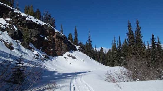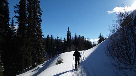 The road was very easy to follow, but did get confusing at one place where the road started to loop “backwards”. I checked my GPS for multiple times and made the call to short-cut it using one of the side-branches. This spur road was steep and icy but there’s some good snow on the side offering tractions. We re-joined the main road higher up and had no further issue following it to the 2.5 km marker, where the Iron Mountain Road branched off to the left. This road wasn’t maintained but the snowmobiles had already packed it down for us.