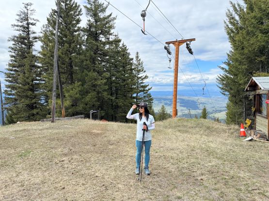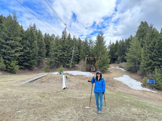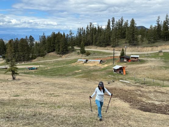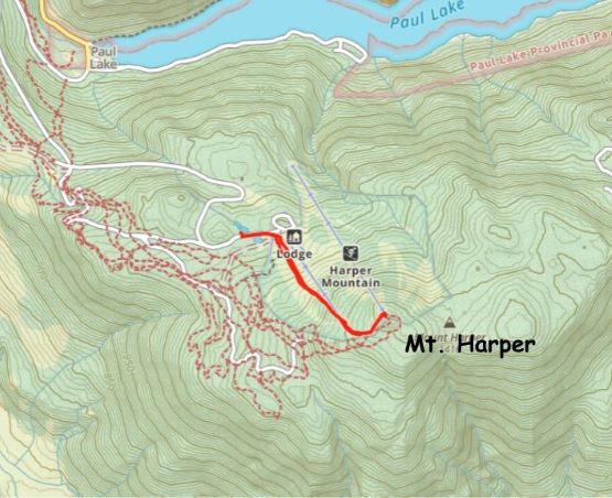 Mt. Harper boasts almost 600 m prominence and is home to Harper Mountain ski resort. I don’t know why there’s a separate ski resort given the Sun Peaks is basically in the same area, but in any case Kate and I snowshoed up Mt. Tod earlier in the morning and I wanted to make full use of the day by bagging at least one more objective. I made Google to direct us to the resort and we got there in about an hour. During the dry season this mountain is more used by downhill bikers and there is literally a maze of MTB trails on the western flanks. There are numerous possible trail-heads for us hikers, but I decided to drive as far as possible and take the open runs in the ski resort. This would give the shortest attack while avoiding the biking traffics on a Sunday afternoon.