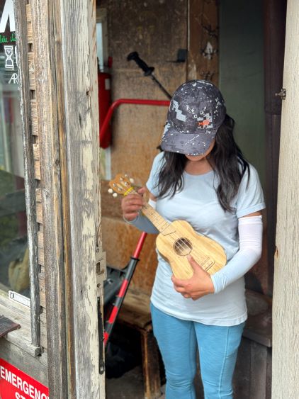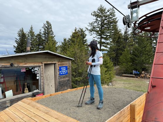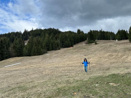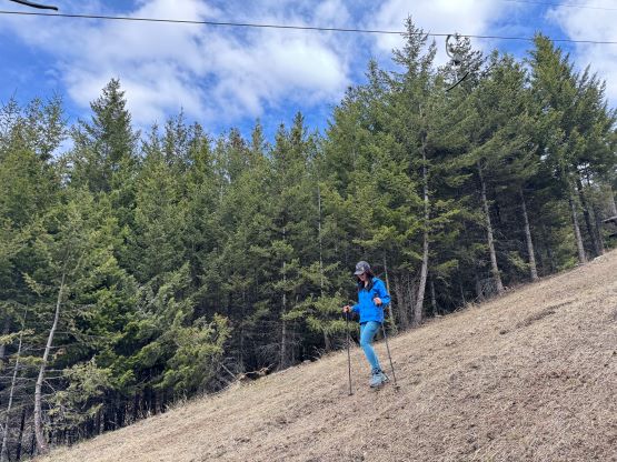It turned out that the resort village was closed for vehicular traffic with the exception of having a permit, so we just parked outside the closure zone, which only added about 200 m of walking anyway. Seeing most, if not the entire mountain was dry we decided to ditch the snowshoes for trail-runners and only carry one backpack. This was the correct call as we were able to avoid snow entirely. The ascent itself was no-brainer as all we needed was to follow the open runs to the top. Not far from the summit we wrapped around to the SW side and and final attack was quite gentle from that side. Perhaps the most notable discovery was a violin inside the upper gondola station. It was not locked so Kate went in and played a bit of her music. The true summit on the other hand, was forested with no view.