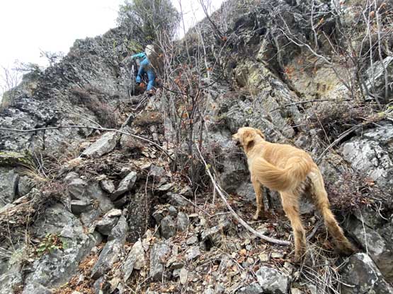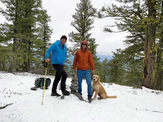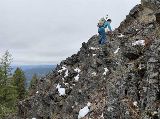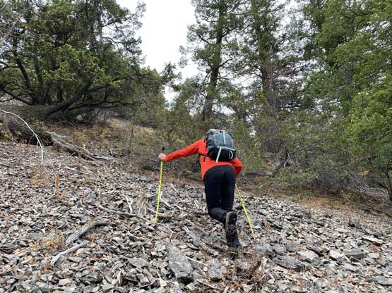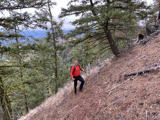 At about 1230 m elevation we faced a major decision-making point. On my Backroad Mapbook may layer I could see spur roads shooting to within 150 vertical meters from the summit but the roads would be roundabout. Matt proposed to ascend straight-up following the south ridge. I reluctantly agreed. The route was rough with lots of steep scree slopes, some up-and-downs and a few bluffs. We encountered 4th class scrambling on loose rocks to overcome one particular bluff although we did not bother to search around for easier options. The summit was disappointingly forested with limited views but we did get some glimpses of views en route to the very top.
