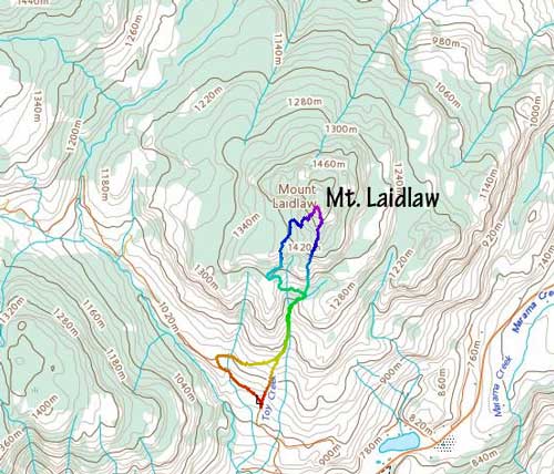 Mt. Laidlaw locates right next to Penticton-Keremeos Highway and is one of the few P600m objectives in the area. Mt. Laidlaw is slightly easier than Blue Mountain and “Peak 1431” as this peak is not located within any First Nation Reserve hence the access is easy and free. The most logical way to ascend this peak is from Sheep Creek Road to the SW and the terrain is a combination of open grasslands, old logging roads, (mostly) open forest and some bluffs. There are a few trip brief trip reports on peakbagger.com and bivouac.com. Matt and I would roughly follow their direction, but also do our own variations. Earlier in the day we had ascended the other two P600m objectives and by this point we had done over 1600 m elevation and we were already tired.