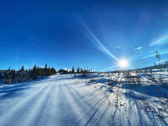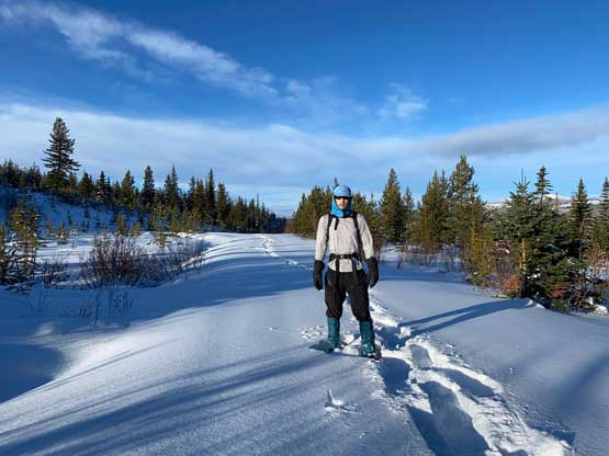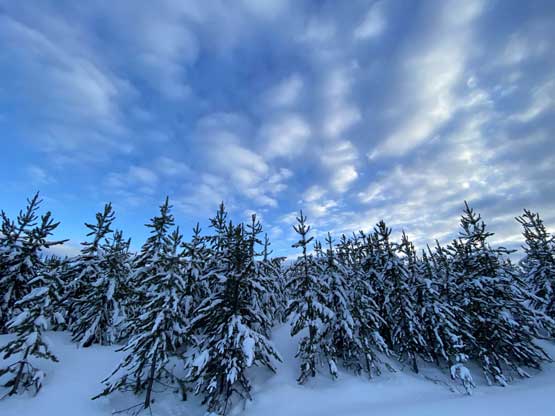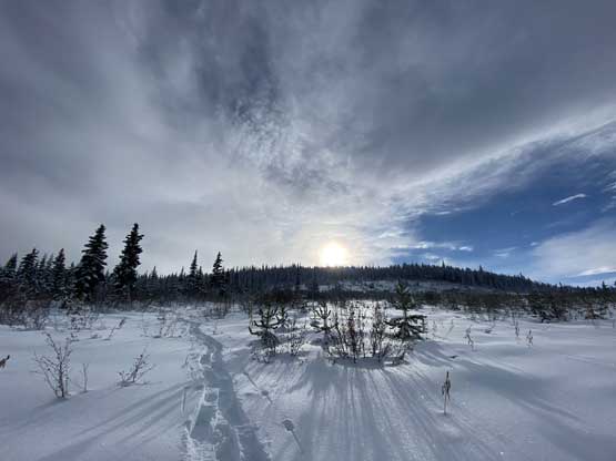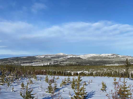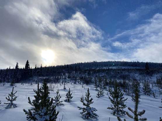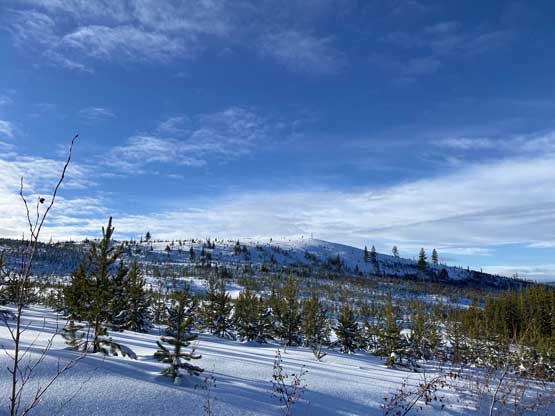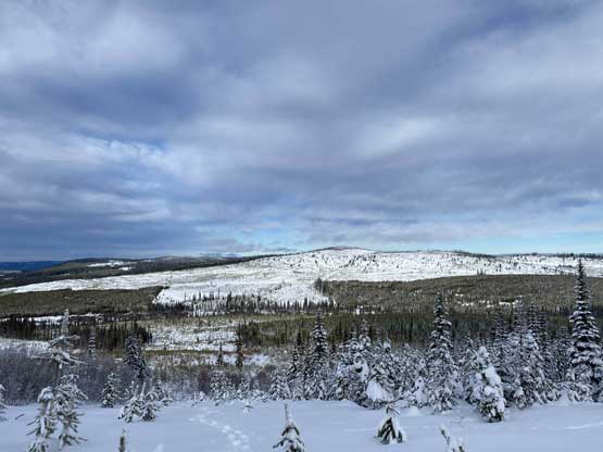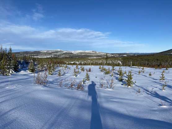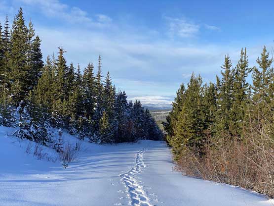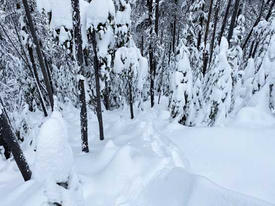 There were several branches of logging roads that I could use to access Mt. Mabel and/or Mt. Bob but to combine the two peaks into one trip and to minimize trail-breaking I picked the middle branch. The initial 2 km of the plod involved some elevation loss but the trail-breaking wasn’t too bad thank to some old snowmobile tracks. Apparently these roads do get some motorized traffic in winter, but just not on a regular basis. The recent snow had covered the snowmobile tracks but the base was still firm. Once I picked up a narrower branch plodding between the two peaks the snowmobile tracks were no longer visible. From here onward the trail-breaking was pretty tiring for the rest of this hike.