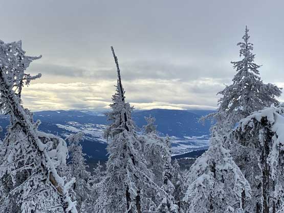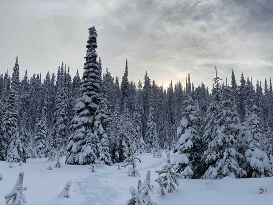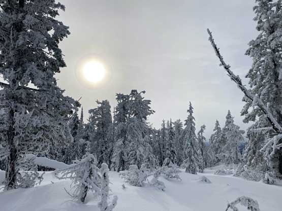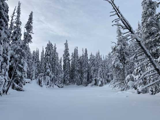 A long while later after some very monotonous slogging I arrived at the base of Mt. Mabel. I didn’t have a firm plan of how to attack this summit but I did have several options in mind. Upon seeing the terrain and the cut-block I decided to gain the west ridge relatively early utilizing the most open cut-block to minimize bushwhacking. The forest appeared very dense despite the snow coverage. It’s also worth noting that on the Gaia topo map Mt. Mabel showed two summits with the same contour lines so to make sure I could safely claim this peak I had to visit both, and the best way for that was to traverse the west ridge. The ascent through the cut-block was pretty easy but I definitely underestimated the challenge in the forest. The uppermost 50 meters to gain the west summit was supposed to be in “mature forest” according to the various satellite images that I downloaded, and with snow coverage I expected cruise-sailing. I was very wrong. The forest might have been a mature one that hadn’t undergone logging, but the timbers at this part of BC was much smaller and denser than the coast making bushwhacking a very tedious fair. There were also substantial amount of dead-falls criss-crossing the slopes and the snowpack wasn’t dense/supportive enough to give me enough flotation. The hazard of falling into tree wells was real and I had to be extra careful since I was alone. The 1-km traverse from west to the east summits had some slightly better forest, but still had several bands of dense timbers and micro-terrain. Not to mention that the views were completely non-existing on the entire ridge traverse due to the thick canopy.