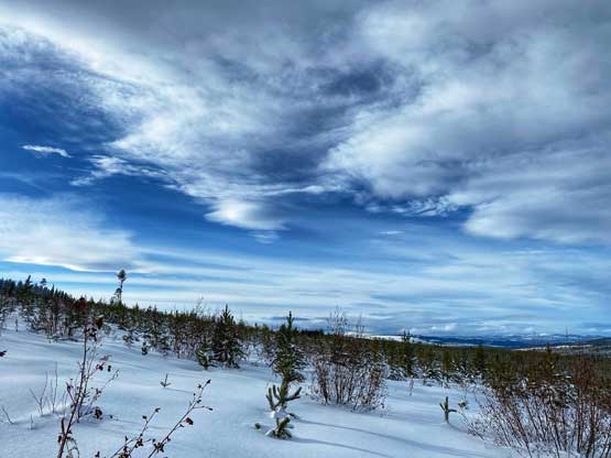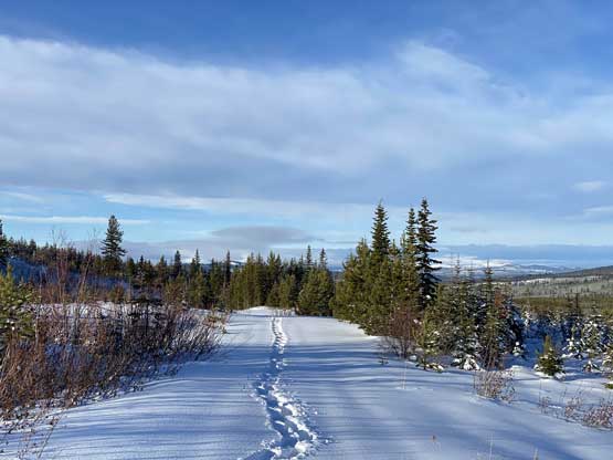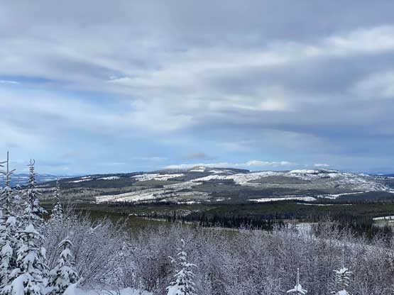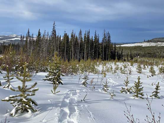 There were several branches of logging roads that I could use to access Mt. Mabel and/or Mt. Bob but to combine the two peaks into one trip and to minimize trail-breaking I picked the middle branch. The initial 2 km of the plod involved some elevation loss but the trail-breaking wasn’t too bad thank to some old snowmobile tracks. Apparently these roads do get some motorized traffic in winter, but just not on a regular basis. The recent snow had covered the snowmobile tracks but the base was still firm. Once I picked up a narrower branch plodding between the two peaks the snowmobile tracks were no longer visible. From here onward the trail-breaking was pretty tiring for the rest of this hike.