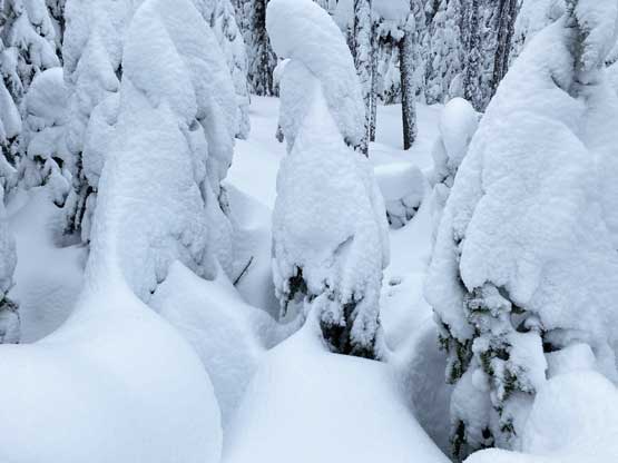 The most efficient way was to resume the west-east traversing mode to reach Mabel/Bob saddle but after consulting with the maps and evaluating the risks I decided to go with the known – to follow my own tracks back out to minimize tree well hazards. This would add at least 2 km of extra distance into the plod but I could deal with that. I still managed to step into at least two deep spots but thankfully I was able to haul myself out. Once getting back down to the logging road I had to turn my attention towards Mt. Bob.