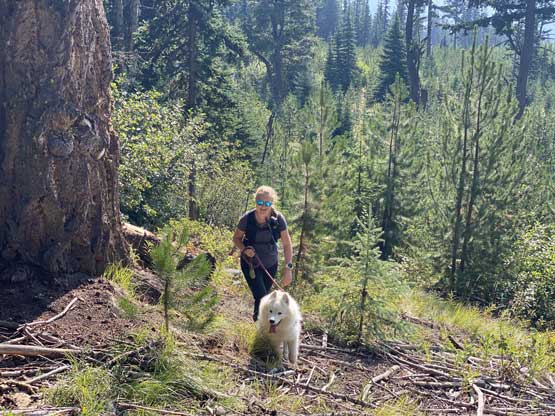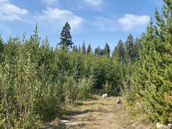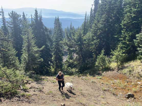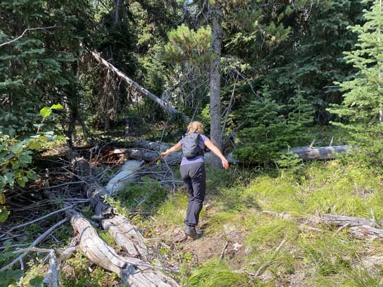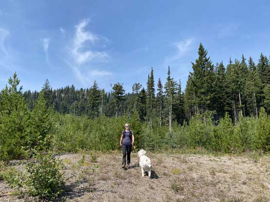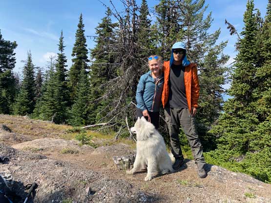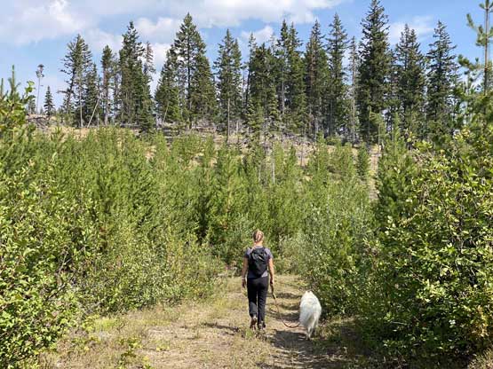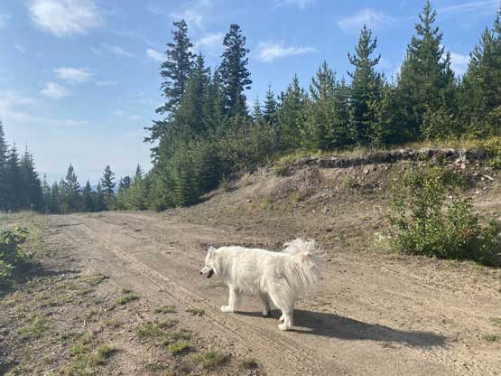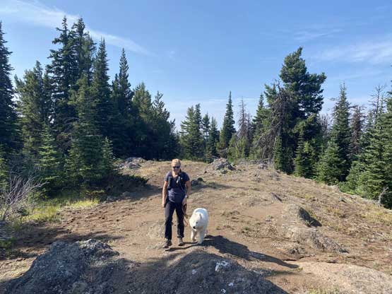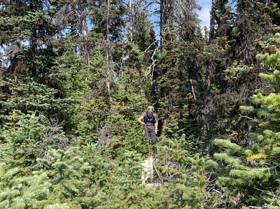 We parked at exactly 1500 m elevation and started the ascent by walking on an old spur road that seemed too overgrown to drive on. From the end of this spur road we dived into the cut-block and simply just picked our own path aiming at the summit area. We encountered short stretches of moderate bushwhacking (dead-falls and young trees) but overall the travel was pretty fluent. There’s one steep section of choss to get onto the broad south ridge, and the true summit was hidden behind a few false bumps as well as one metal wire fence. Christine’s dog, Makwa was having some trouble on this day but after much struggling he did manage to make the summit as well. The dog was not listening to any order so we agreed to put him on leash for the rest of this trip.