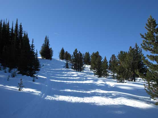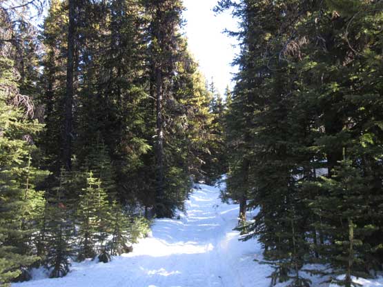 On the descent I opted to boot-pack on the snowmobile tracks instead of snowshoeing. This was easier on the knees but the downside was some moderate degree of post-holing on a couple flatter zones. I made at least 50 deep holes but whatever. Once I got back to the main road the rest of was an easy plod back to the parking lot.