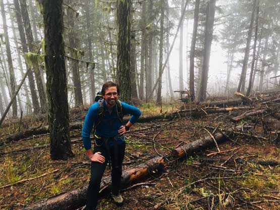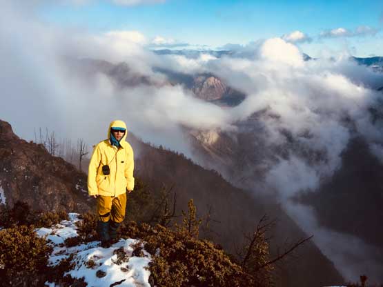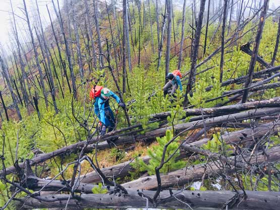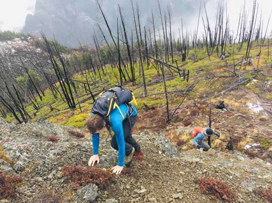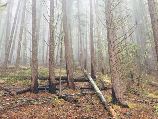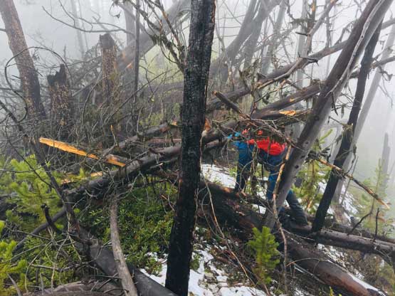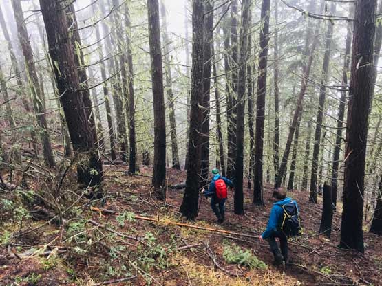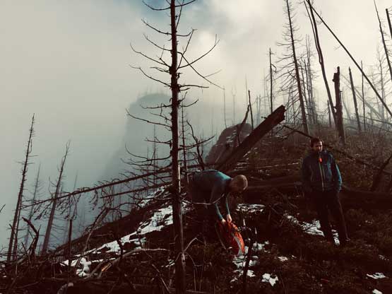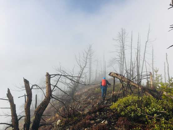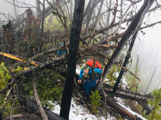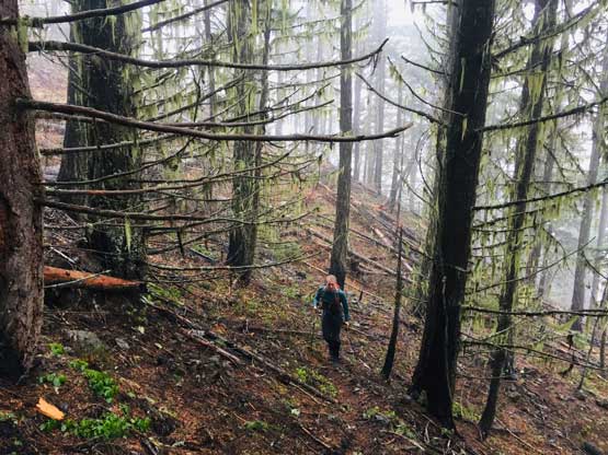 We decided to enter the forest before reaching the highest spot on the spur roads at around 1200 m elevation. It really didn’t matter where exactly to enter the forest as bushwhacking is unavoidable. The ascent up through the mature forest was easier than expected but the weather continued to drizzle on us. The stoke level was very low but at this point we were already committed to make the summit no matter what. We managed to pick up what seemed like an user-maintained trail in the woods and followed it all the way to the summit ridge. The travel on the ridge was nowhere as pleasant as in the woods due to the criss-cross of dead-falls and lots of young trees. The logs were a totally mess and very slippery when wet. We were all soaked through in no time but again, there’s nothing else to do other than pressing on. We had to crawl up and over a shit ton of logs but thankfully the worst of those weren’t super sustained. There were always some nicer stretches of ridge-walking to keep our hope relatively high.