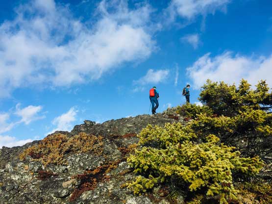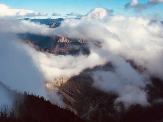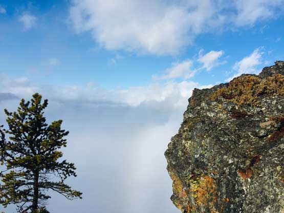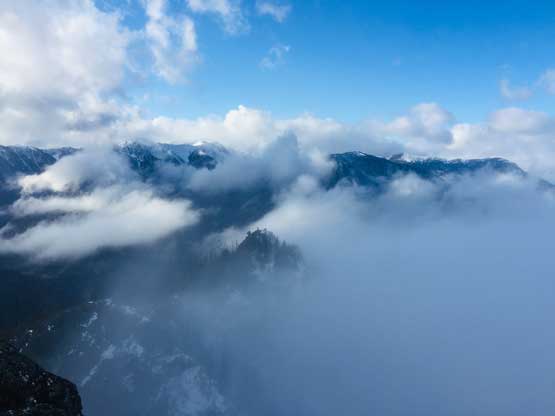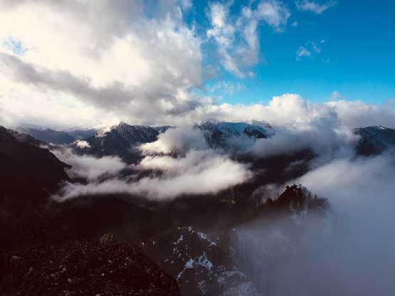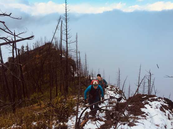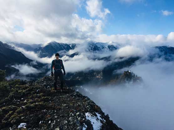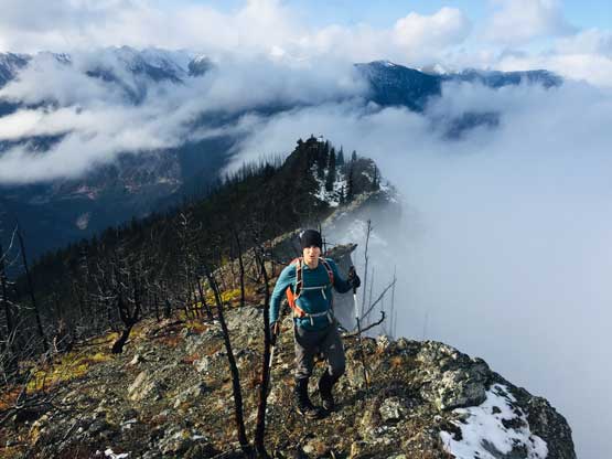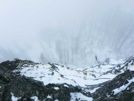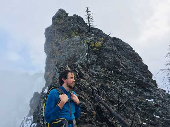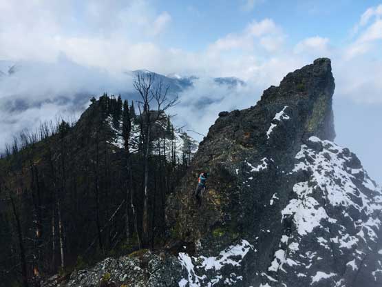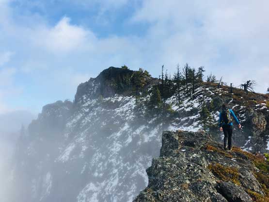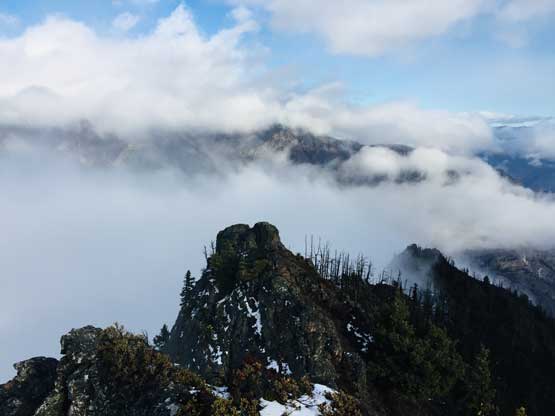 At this point the weather finally started to improve and we could see the first glimpse of blue colours of the day. The Seton Lake valley were covered in fog and we were above that layer of clouds. The traverse of the summit ridge was also more fun than expected and even offered some scrambling oppourtunity. We all scrambled up the first 3rd class step but opted bypass the next tower. The true summit was pretty well positioned for looking down into the town of Lillooet and Fraser Canyon and despite the clouds, we were all pretty satisfied about the views. We lingered up there for over half an hour but there’s no sign of further improvement.