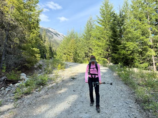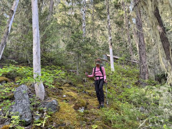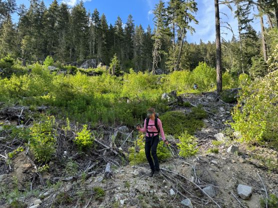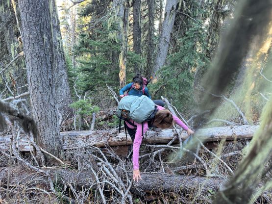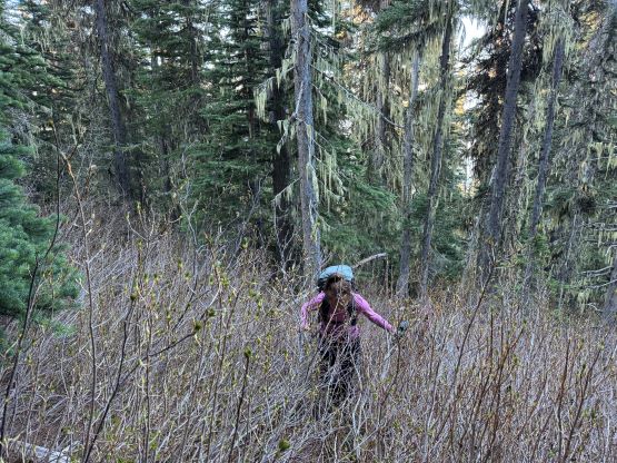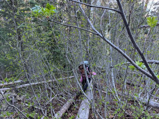 I decided for us to wake up at 4:30 am and we did not sleep in this time. I quickly got up and made some hot breakfast for Erica and Miranda, and we eventually started the day about an hour later. We only had 1 km of road-walking so opted to wear the mountaineering boots truck-to-truck, and the bridge crossing North Lizzie Creek was still intact. For the bushwhacking we roughly followed Simon’s route by sticking on the climber’s right side of the creek draining from the valley between Twin Two Peak and “Asherah Peak”, and the going was very straightforward for about one third of the way up. We also encountered what seemed like a new logging road that was not shown on Gaia map nor the satellite images. The bushwhacking quickly became heinous with a zillion of dead falls and the going quickly escalated into that usual game of pick up sticks. The sticks were also stiff and pocky and some careful work was needed for every step forward. The suffering was much worse and longer than I thought but we all handled it well, mentally and physically. I have to thank Caro Coco et al. for getting both Erica and Miranda trained in this bushwhacking game because they basically were able to keep up with my pace and I was not going slow.
