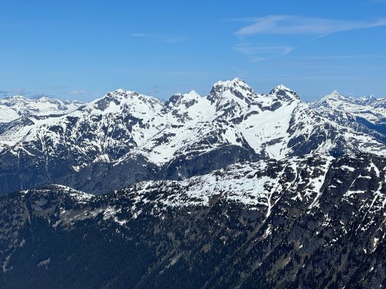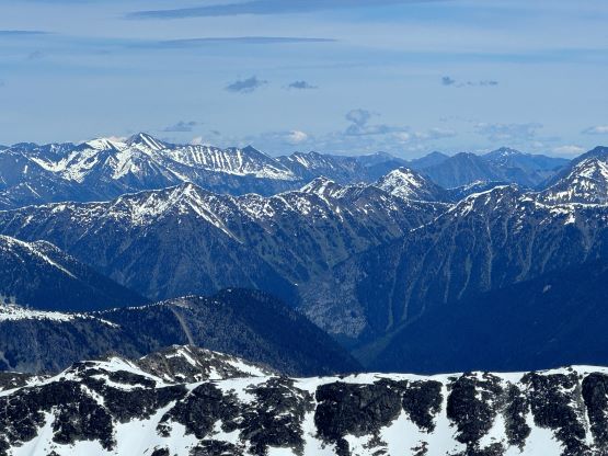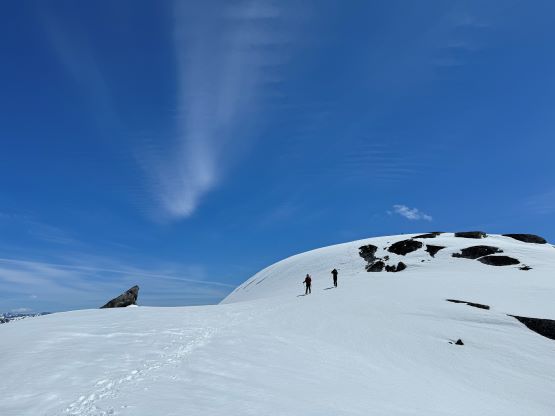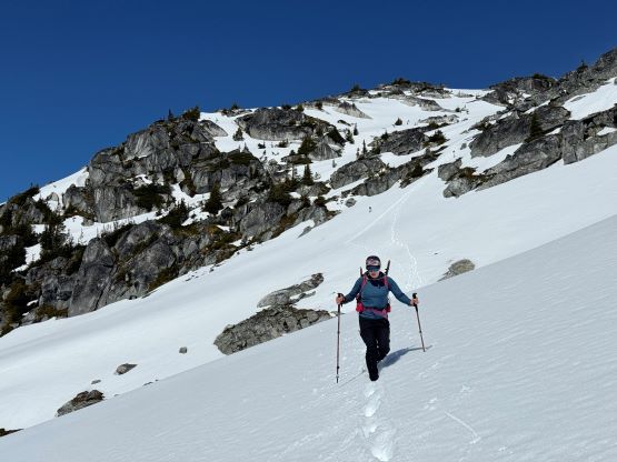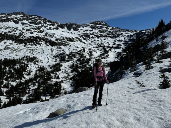 There was no break to be made until the bushwhacking turned into post-holing at 1800 m elevation. The snow in the forest was very soft and that forced me to make one stop to don gaiters. We took a proper break about 50 m higher in the sun and with views. The next stage was to follow the obvious west ridge through the treeline zone and the route involved a few steeper rolls. The snow was actually quite firm in the open and we almost had to don crampons. I however, taught Erica some edging techniques so the crampons stayed in our packs until much higher. There were some micro-terrain but nothing really worth noting and after what seemed like a long time we made to the point where the connecting ridge from Twin Two Peak joins Asherah Peak’s west ridge.