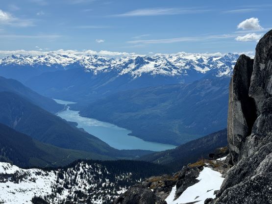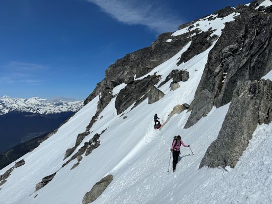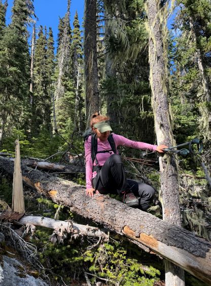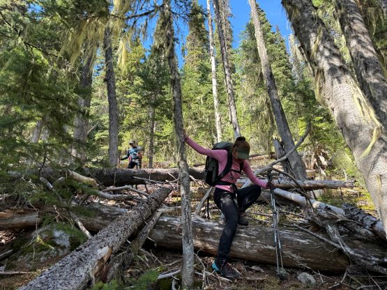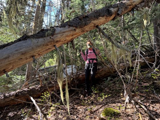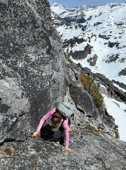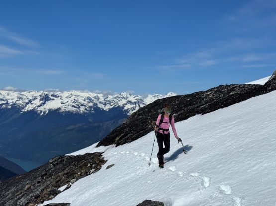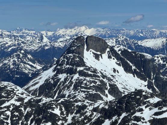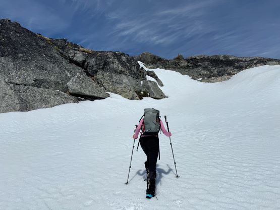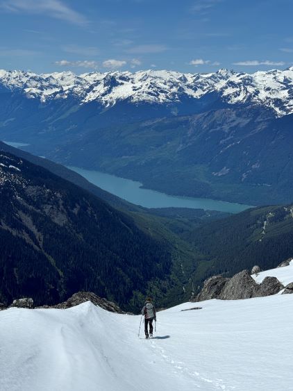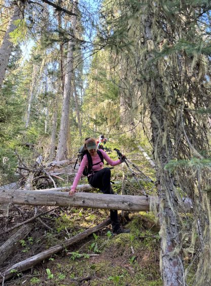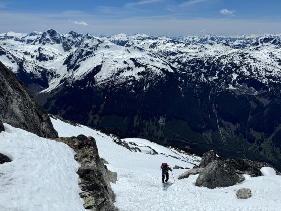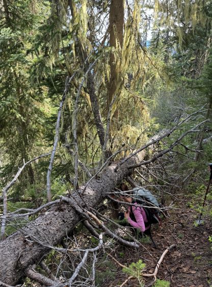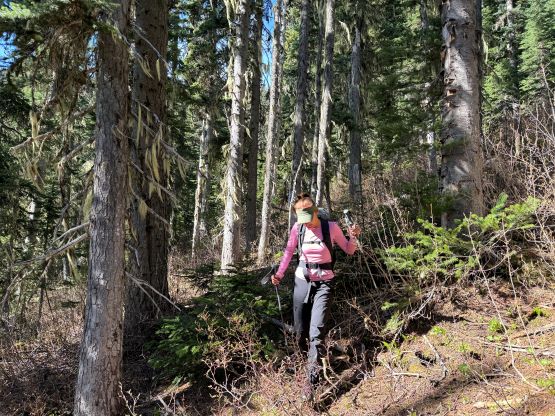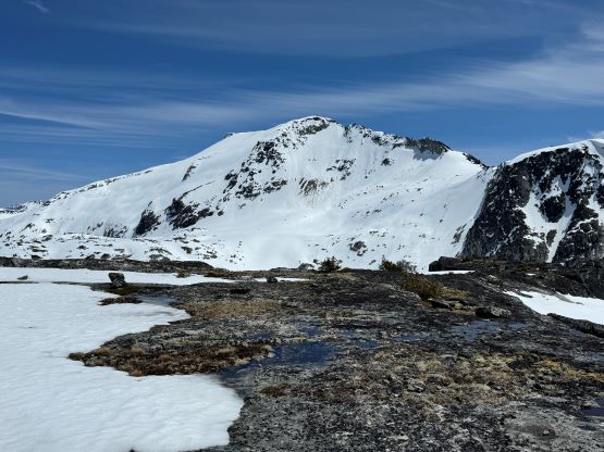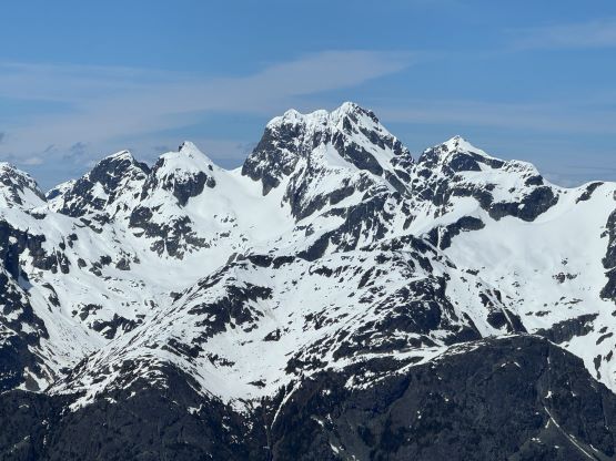 The down-climb of that slab corner with not easy and required a few lieback moves, and the snow condition was much worse. While plunging down we constantly sank ass-deep but honestly that was to be expected at this time of a year in the drier interior zone of the Coast Mountains. There was one melted pool and Miranda had actually brought a filter, so we did our second batch of water loading without turning on the stove. I then led us rejoining the west ridge of “Asherah Peak” by an exploratory traverse and was successful in minimizing elevation regain. The post-holing was horrible but at least we were descending, and the bushwhacking, though terrible, was tolerable as again, we were descending. The pick-up sticks were actually kind of fun on the way down because we just had to scramble from one log down to the next and then repeat. There were probably 500 dead falls and this route is definitely not for the averaged. Our round trip time was 12.5 hours but over 4 hours were “stopped time”. Erica drove us back to Pemberton after I got us down the FSR section, and that allowed me to take a short nap. We had dinner in my go-to place (Mile One burger) and then I did the rest of the driving, back home at midnight.