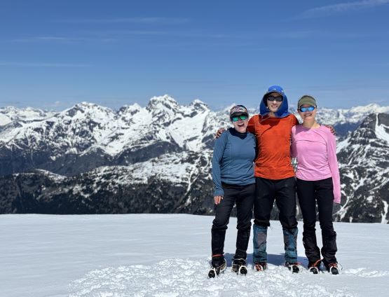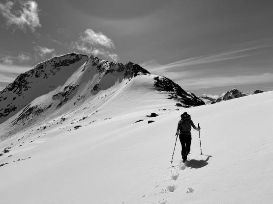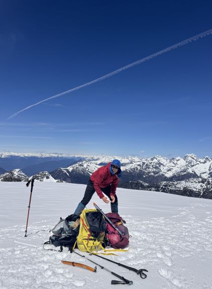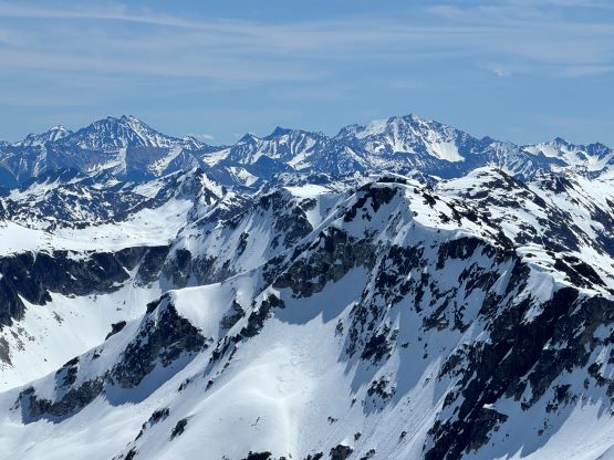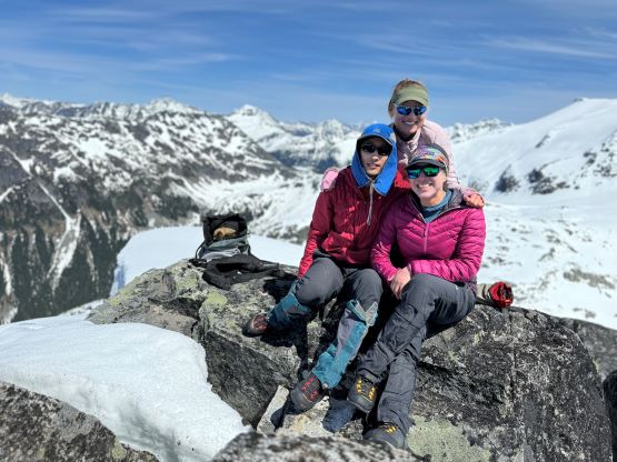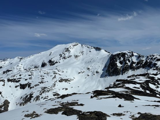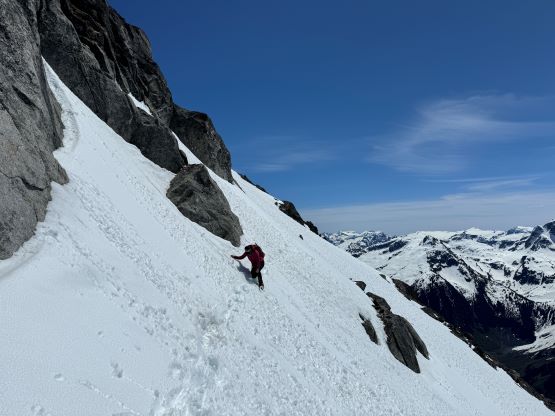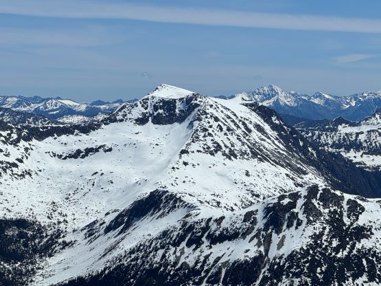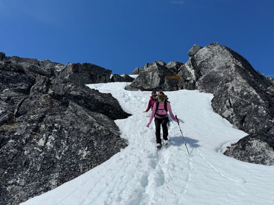I had decided for us to carry 1.5 L of water each maximum because I brought a stove with fuel and planned to melt snow along the way. The 1.5 L water was enough to get us up Asherah Peak so while taking the needed break I melted another 3 L of water for us. We did a very long summit stay but eventually had to get going, and the decision was made to take the exact same route back even though I knew there were a few spots that we could have done better. The post-holing was already taken over and I wanted to stay with the knowns. I then led us down-climbing a steep chute which was essentially the short-cut to link the two peaks together. I knew Simon went further down and around but I wanted to minimize post-holing. Erica and I then took turn breaking trail (knee+ deep) to the south ridge of Twin Two East, and then we all scrambled the SE Face direct to the summit. There was one 4th class slab corner with lots of loose rocks but we preferred that over additional post-holing. The E. Peak is the higher of the two and I felt no need to traverse to the lower W. Peak, so we took another long break on the summit.