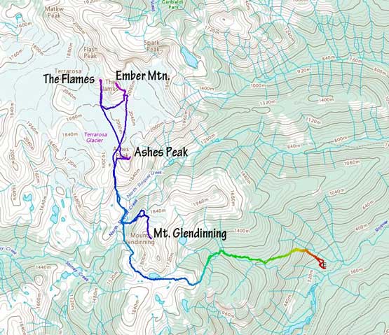 Ashes Peak is the easiest summit in the Fire Spires group on Terrarosa Glacier but it’s still a beautiful-looking peak. The ascent is nothing fancier than a 100-m slog on snow from Terrarosa Glacier but the question is how to get there. Earlier in the trip Alex, Phil, Francis and I had climbed Mt. Glendinning and Ember Mountain. I then soloed the true summit of The Flames and now all of us were on our way to Ashes Peak, the final objective in this trip. We were thinking to do two more peaks but those did not look interesting enough so nobody was keen to push.