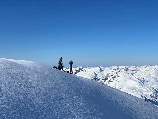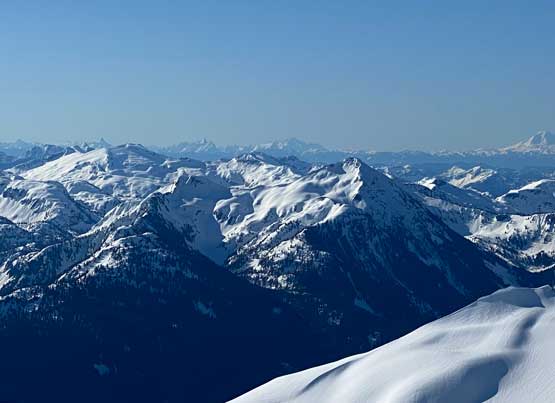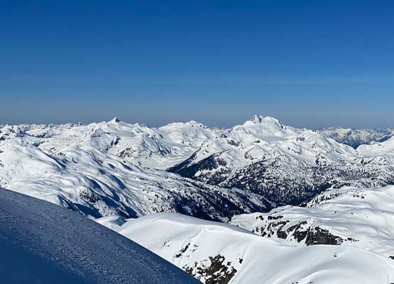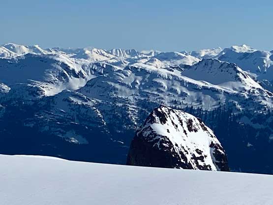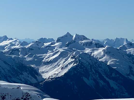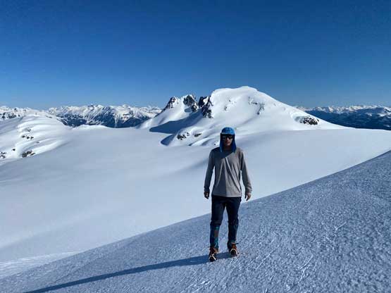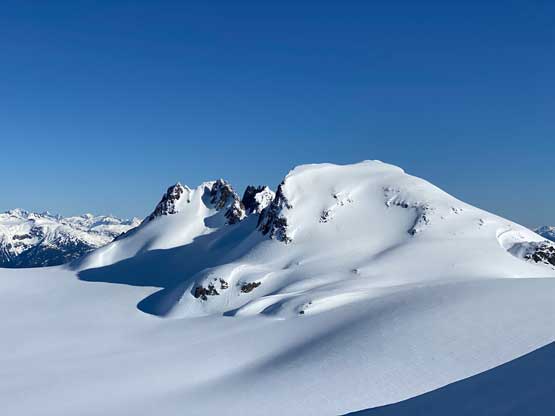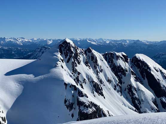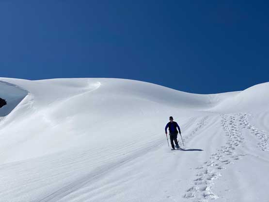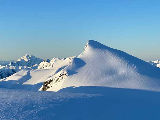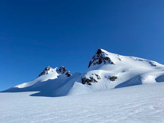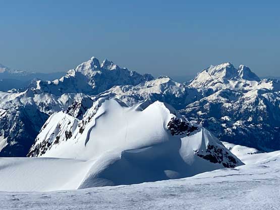 The other guys were all very much near the summit of Ashes Peak when I started the plod backwards across Terrarosa Glacier. I opted to use snowshoes as plodding on snowshoes was a little bit faster than on crampons. It didn’t take me long to start the 100 m elevation gain towards the summit. The slog seemed to drag on longer than expected. The summit of Ashes Peak had some huge cornices that we couldn’t tell the boundaries so we had to say no to the 360-degrees views. That’s fine as the best views were looking north towards the Fire Spires.