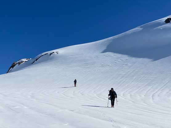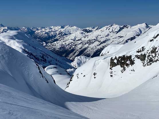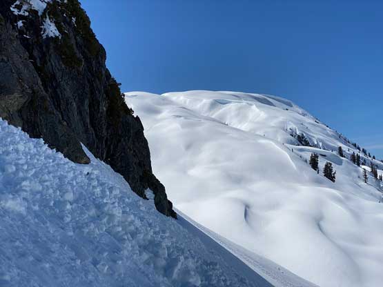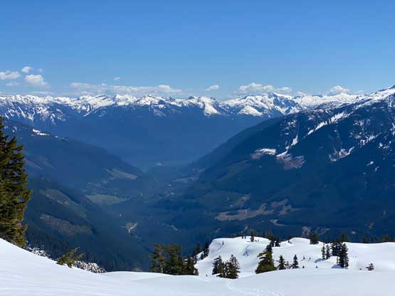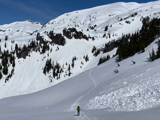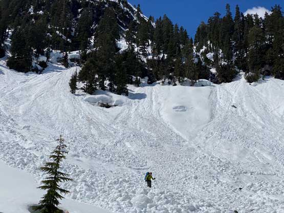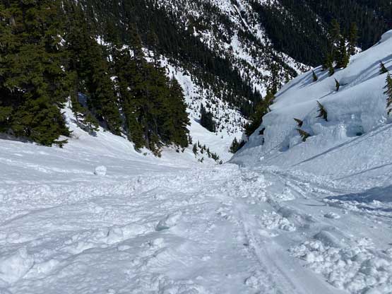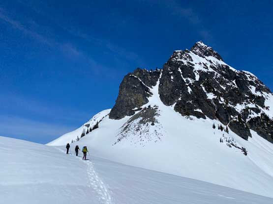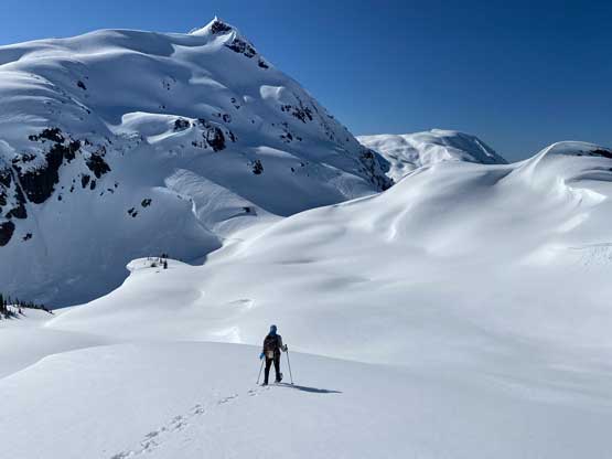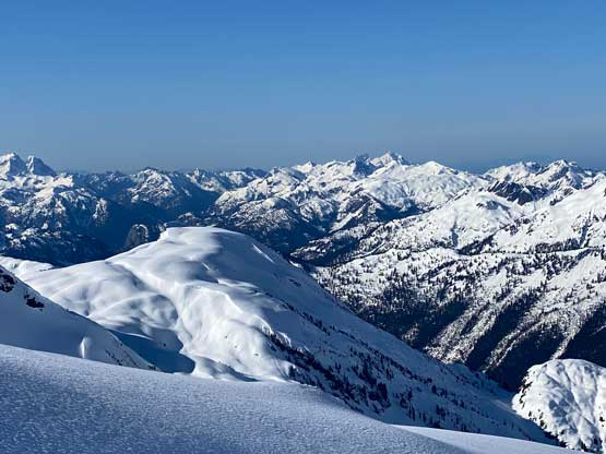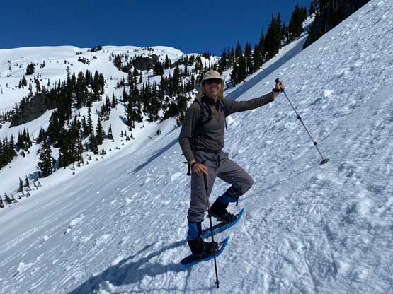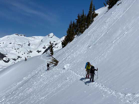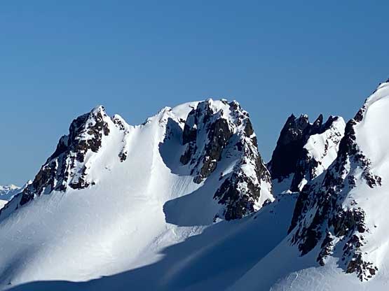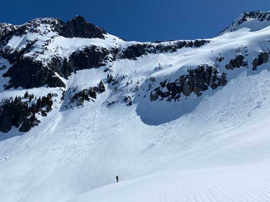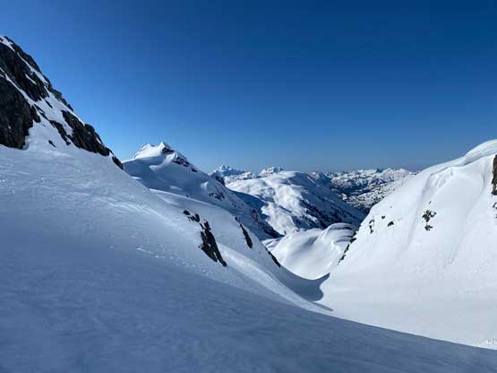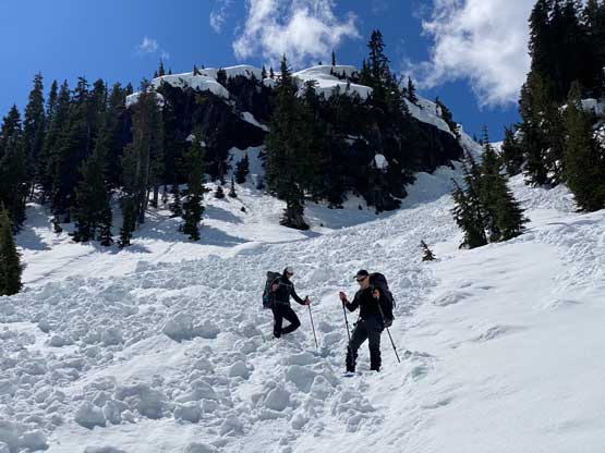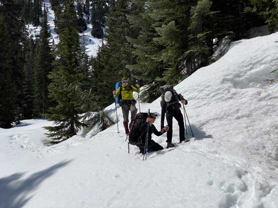 The massively long traverse across the west slopes of Mt. Glendinning was still in the shades so the snow condition held nicely. About halfway across this awkward traverse we met up with Vlad on his way in. Vlad had no idea where Chris was so we assumed that Chris was at least one hour behind. Vlad did not come with an ice axe nor crampons so to make sure he could summit Ember Mountain I lent my Petzl Gully to him, little did we knew that he would eventually come out with two ice axes in hand.. The 150-m regain to get back onto Mt. Glendinning’s south shoulder was a tiring grunt and nearing the end of this stretch we met Chris coming in. Based on their pace and their location we knew they would definitely get Ember Mountain but they probably would have to get out near dark. We resumed our respective paths with us post-holing in increasingly mushy snow down towards the chute. The section above the chute was an absolute shit show with every step post-holing down to knee+ deep in the isothermal cement. We all had concerns about the chute itself but there’s no other option. About 1/3 of the way down the I took the snowshoes off and started to glissade, which seemed to work better. Wherever still in shade the conditions were still icy so all of us were out of control momentarily. The bottom of the chute was a pure crap with some thigh deep wallowing even with snowshoes back on.