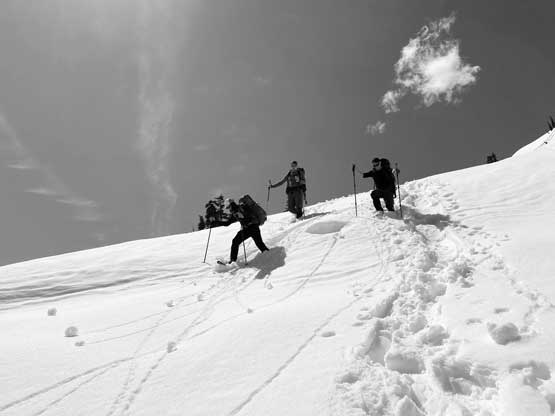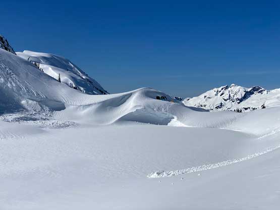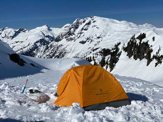 On the descent three of us opted to use crampons and we took a short-cut directly plunging into the chute that would eventually bring us back to camp. Halfway down the chute the snow had turned into mush and the post-holing had become knee deep, so we stopped to put snowshoes on. The snow condition deteriorated rapidly such that by the time we got back to camp we were post-holing in mush even with snowshoes on. Because of that we did not do any unnecessary lingering. A few of us were busy to break camp while Alex took his time melting additional snow for water and for a hot lunch. About an hour later we were able to get going again.
