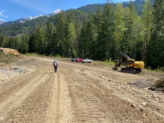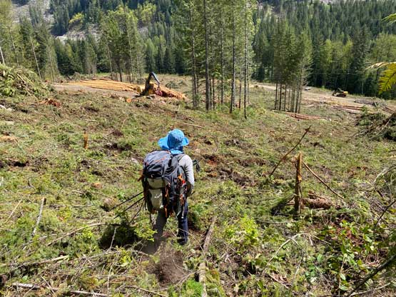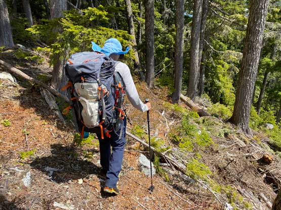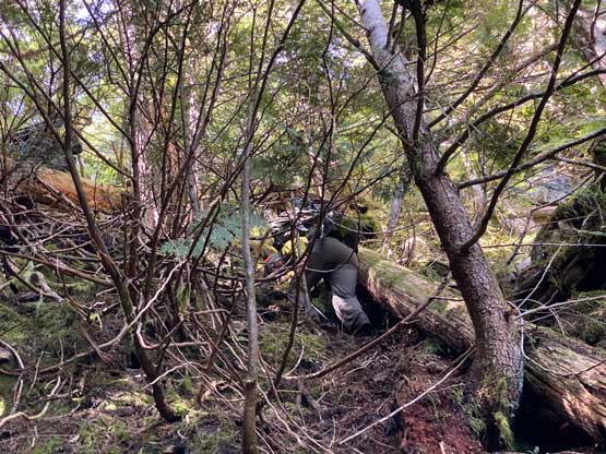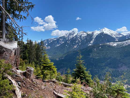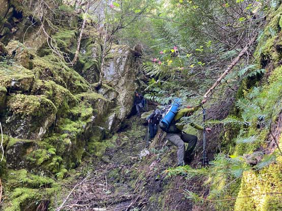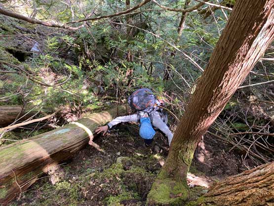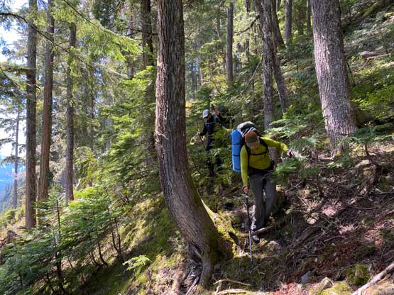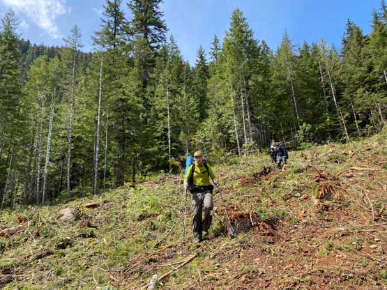The plod back across the valley right next to the creeks was definitely mushy, but not as terrible as the steep zones such that we were able to make steady progress. A few spots had some deep holes but that’s it. We stopped at the creek crossing to load up the water bottles and then wore snowshoes all the way to the edge of the 3rd cut-block until completely running out of snow. We did not stay as high as on the way in, so did more bushwhacking inside those cut-blocks, which wasn’t as bad as I thought. The traverse/descent back to the “keyhole gully” was not very pleasant with some level-3 bushwhacking over dead-falls and consistent requirement in GPS navigation. The keyhole gully wasn’t too bad to descent but we had to take our time due to rockfall potential. We took another break somewhere in this steep forest as we were tired and hungry, and then committed to the rest of the descent. We eventually got back to the truck at 2:30 pm. Phil realized that he had dropped my aluminum ice axe somewhere, so we hoped the other team could find it and bring it back. And sure enough 6 hours later I got a text from Vlad that he ended up having two ice axes.