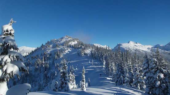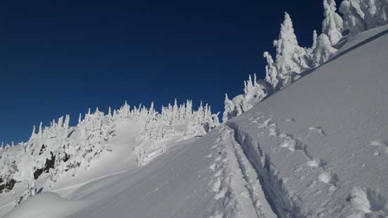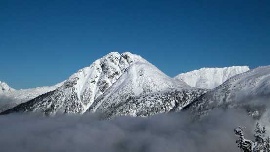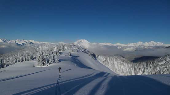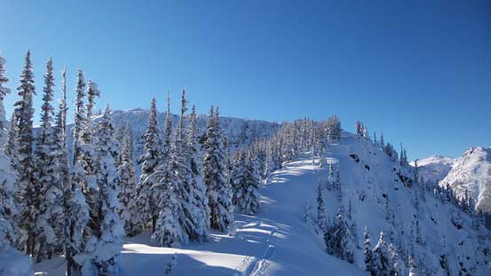 The ridge started out easily as we traversed up and over another subsidiary summit but then it narrowed down to within a couple meters. The grade also got a little bit steeper, but again, it’s still a forested ridge so nothing tricky. Soon we got down to Haven/Beacon col.