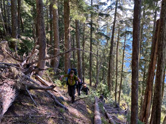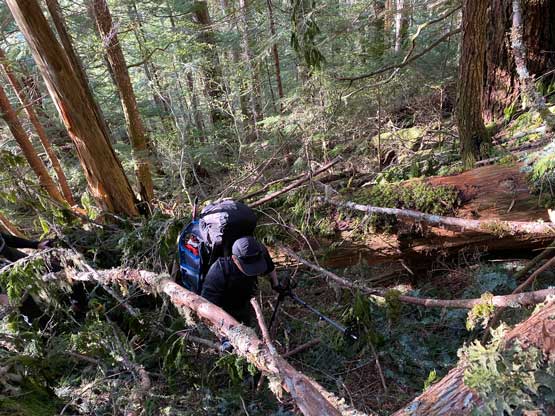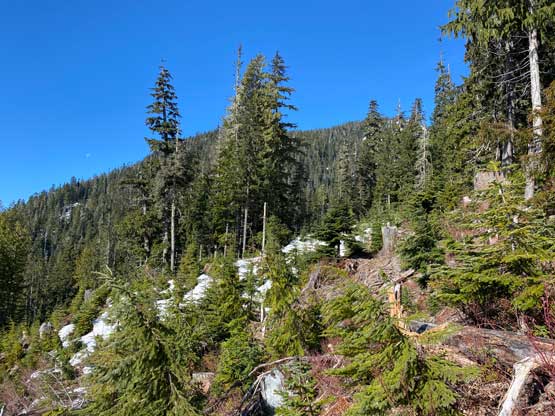 The plan was to wake up at 6 am but at 4 am logging trucks came to wake us up. I thought we were seriously screwed but Francis went out to talk to the guy and they actually allowed us to camp/park in their work zone. What a pleasant surprise. I still do not get why they were logging at 4 am on a long weekend Saturday but I guess they needed money really badly…. The consistent noise meant we could no longer sleep so by 5 am we might as well just get up and go. The lowest 100 m was messed up by the logging so we just walked on the newly-built roads. We did not walk to the very end as one machine was working to push the road even further and we didn’t want to directly encounter that guy (who wasn’t the person Francis talked to earlier). We bailed into the forest on climber’s left and soon started to just follow Matt’s GPS track. The route was obvious as we were ascending a rib feature for a while until directly underneath some imposing bluffs. The bluffs forced us to ascend a traversing line towards climber’s left and at the end of this traverse we scrambled through the “keyhole gully” that was mostly 3rd class on tree roots. That was the critical point of the “Juhasz Route” as this gully offers the only possible break through the forested bluffs. Once above the gully we maintained a diagonal bearing out to climber’s left. The terrain forced us to shoot straight the hell up but the GPS track told us to traverse left, so this next section needed some high concentration on route-finding and substantial bushwhacking. After about 500 m elevation gain from the truck we came to the upper edge of the first cut-block and soon after, the second cut-block (all from heli-logging). Instead of following the GPS track through the second cut-block I led us hugging the upper edge while staying in the old growth forest. This proved to be mostly free of bushwhacking. At the edge of the third cut-block above 950 m we suddenly encountered snow. We boot-packed across to the left (west) side of this third cut-block, made a short detour to load up our water bottles and strapped the snowshoes on, and this was just under 1000 m elevation.