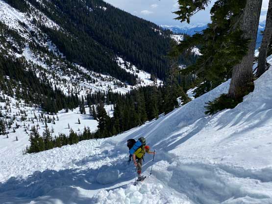 The “Fire Spires” on Terrarosa Glacier consist of a handful rugged towers but the highest one, Ember Mountain boasts a gentle slope from the south side. This group of peaks locates in a very remote area in the south-east corner of Garibaldi Provincial Park. Ascents of any of the Fire Spires are rarely heard these days. The access was used to be from the north from Fire Lake but the status of that road was unknown and one would definitely expect additional wash-outs from the apocalyptic storms in November 2021. The other access was from North Sloquet Creek but again, the bridge crossing that creek was pulled and the road had long turned into an overgrown mess and the elevation is too low for substantial snow coverage even in winter/spring. Then in May 2021 Matt Juhasz resolved the mystery by drawing an entirely-experimental route from the south-east side of Mt. Glendinning, by a direct attack of the insanely steep forested bluff above Sloquet Creek main-line FSR. I had also been looking at this aspect but I seriously doubted the feasibility of that steep forest. Matt then went for a gamble and succeeded in grabbing Ember Mtn. as a day-trip and since then, at least one party had followed. I can totally see this becoming the new-standard route which I would call the “Juhasz Route”. This is the most efficient way to get into the Fire Spires but needs a thick snowpack covering the bushes from 1000 m elevation onward to treeline so I don’t know what to expect in summer time.