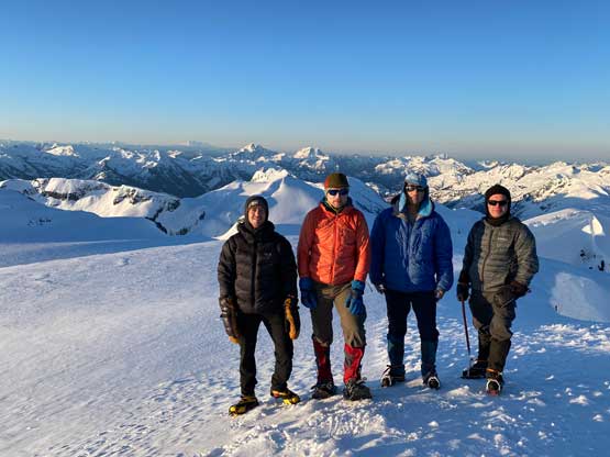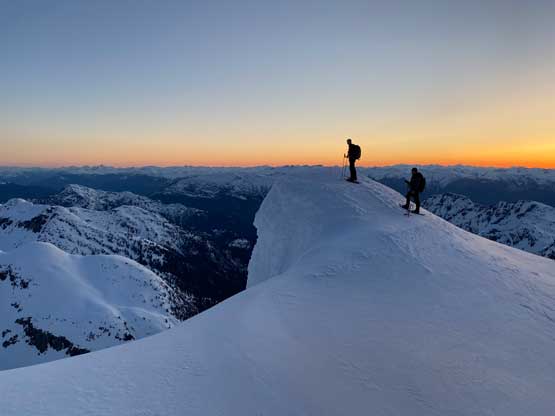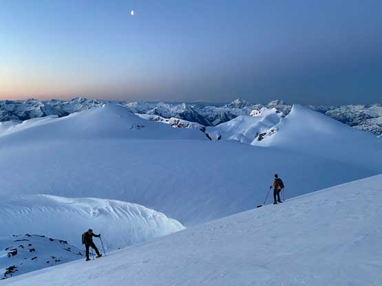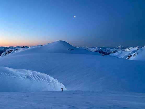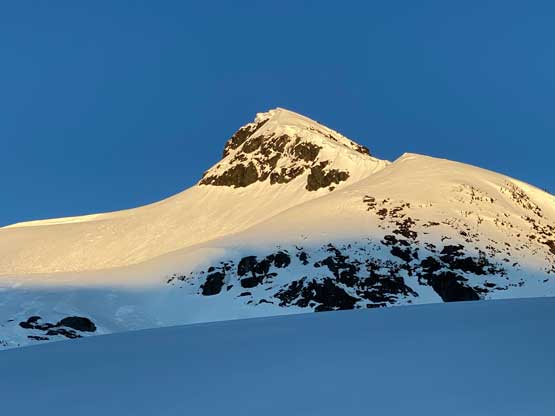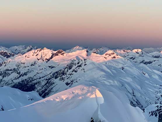 In the pitch dark we descended slightly onto the frozen lake immediately below our camp and plodded across the lake. The far (north) end of the lake had a bit of micro-terrain that wasn’t very obvious in the dark. We ended up traversing a bit farther than needed but we did find an efficient way to traverse into the foreshortened gully that would eventually lead us onto Terrarosa Glacier. Through this gully we ascended 300 m elevation on firm and crusty snow and then we popped out onto the icefield still in pitch dark. The plod across the icefield towards Ember Mountain’s SE slopes was longer than it looked. The ascent of Ember Mtn. was also trickier than expected with one steep roll that was on the edge of the capability of our snowshoes. The slope angle was approaching 40 degrees on a couple rolls and the conditions were rather icy. We made the summit about 15 minutes before sunrise so we got a full show from alpenglow to the golden glow. Two of us even caught cell phone reception on this remote summit and I updated my peakbagger app…