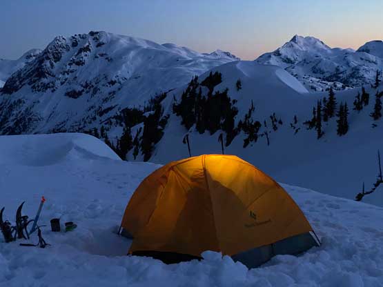 The next stage was a cruise-sailing to Mt. Glendinning’s south col at 1750 m with only minor micro-terrain to content with, but as expected the weather system moved in and we lost the visibility. We had to deal with flat light conditions and light flurries. From the south col we had to drop over 150 m elevation while contouring around the west flanks of Mt. Glendinning and this section was trickier than expected. We more-or-less stuck to Matt’s GPS track as we couldn’t see much ahead. There’s one steep but short traverse in the descending stage and then a long and steep side-hill traverse was required to ascend onto Glendinning/Ashes saddle. A few spots in this final traverse surely put our snowshoeing skills in test but the weather was slowly improving at least. We found a neat wind scoop at the saddle to drop our packs and spent the next hour setting up tents and relaxing. We left for Mt. Glendinning at 2 pm and made back two hours later. I then took a nap in the sleeping bag (-32 C rating) as there’s literally nothing else to do. I woke up about an hour before sunset, cooked dinner, did some photography and went back into the tent. The alarm was set at 3 am and the plan was to watch sunrise from Ember Mountain summit.