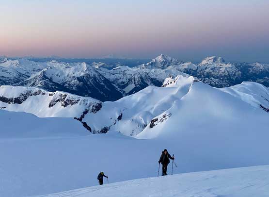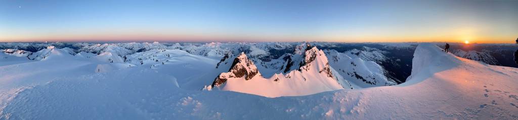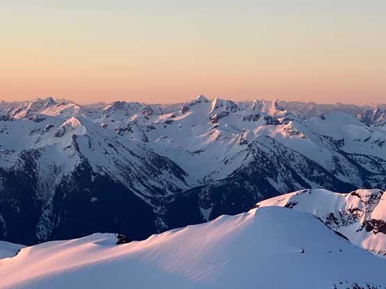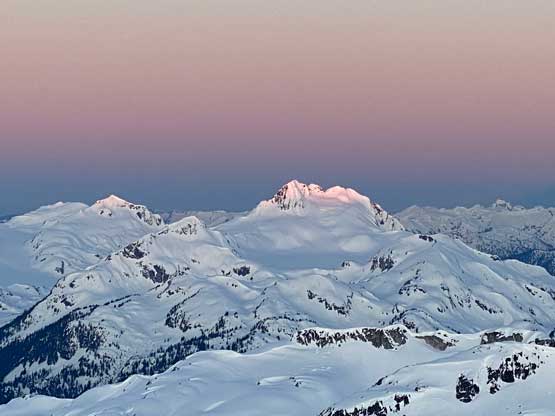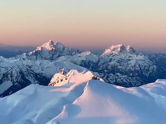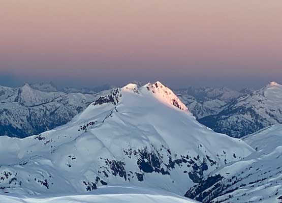 The tips of Mt. Baker and Mt. Judge Howay catching the first rays of sun beams