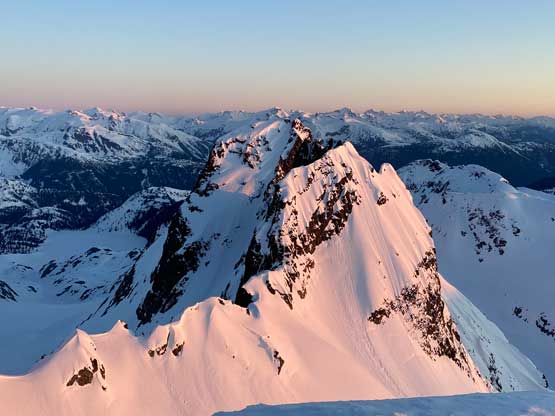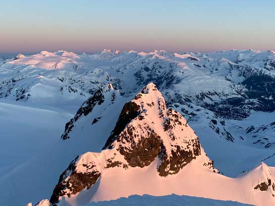 Evening alpenglow on Old Pierre Mountain, an iconic but very remote objective