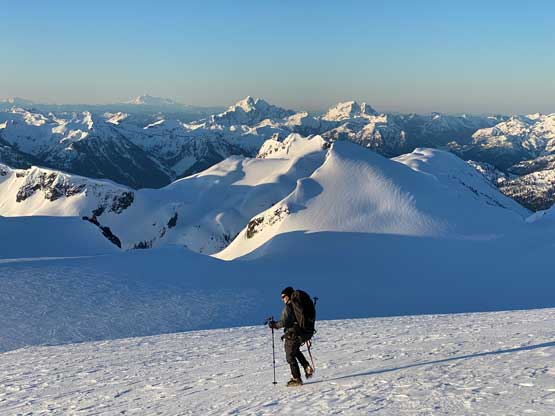 After having enough of the views we leisurely descended. Three of us opted to swap footwear to crampons. At this point I was still hoping for Matkw Peak so I led us away from our tracks contouring around the south side of Ember Mountain to the SW side, until I saw the south side of The Flames up-close. I already had a good view of the upper portion of The Flames (East/True summit) from the summit of Ember Mountain and now with the view of the lower route I determined that it’s possible to climb it while entirely staying on snow. Subsequently I changed my mind from doing Matkw Peak (which looked rather boring) to The Flames. The others weren’t keen so I borrowed a second ice axe from Francis and swapped crampons with Phil. My Petzl Irvis Hybrid weren’t ideal for steep front-pointing but Phil had brought a pair of steel crampons. The trip then continued with a solo climb of The Flames, followed by an ascent of Ashes Peak, and then a long and tiring descent and drive home.